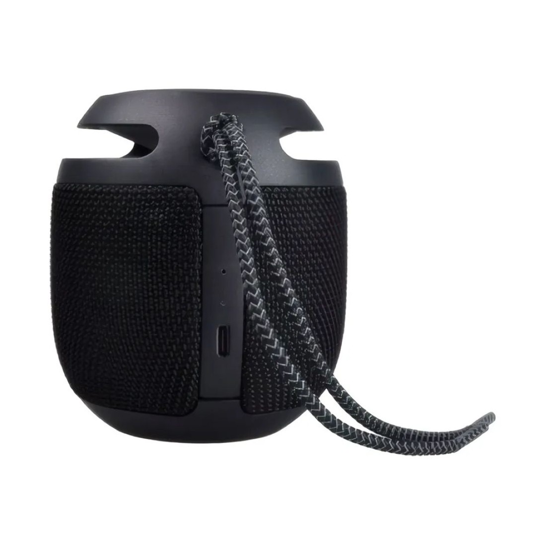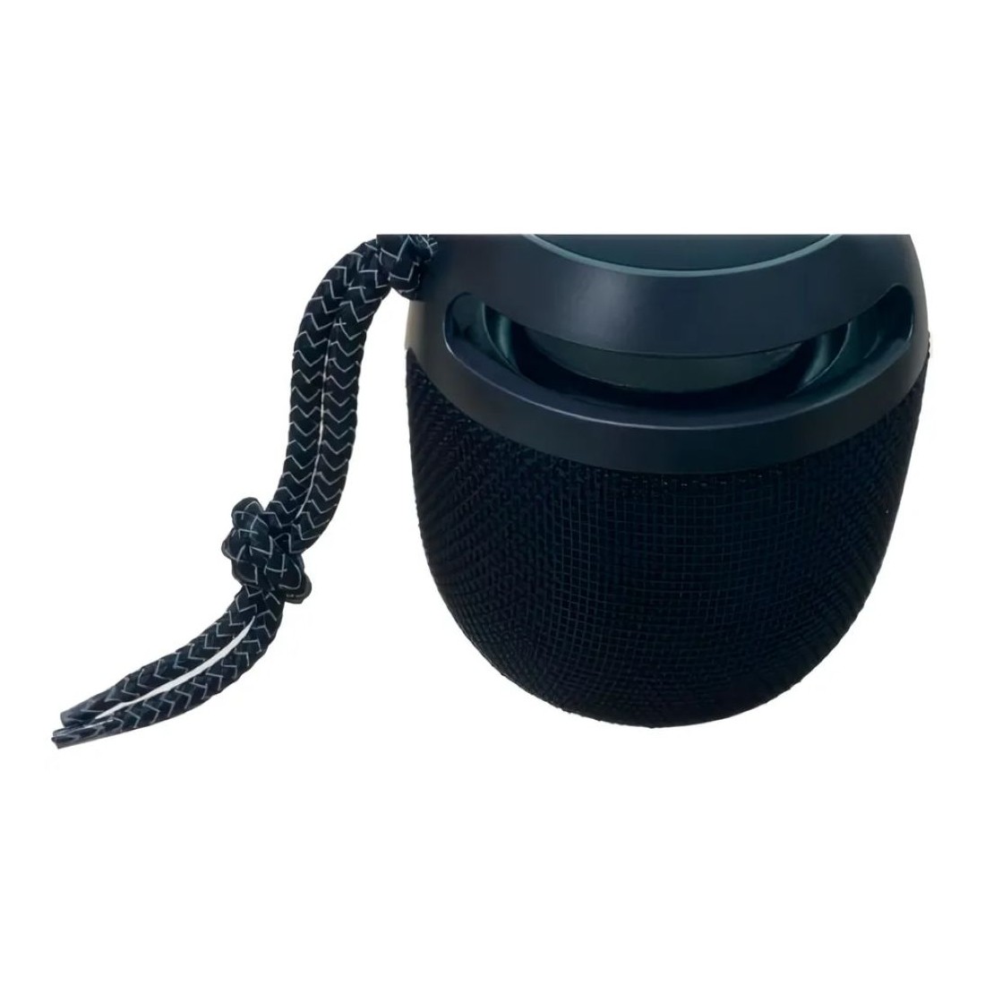 Este altavoz portátil en color negro combina estilo y practicidad. Su acabado en tela le da un aspecto elegante, mientras que la correa integrada facilita su transporte. Ideal para quienes buscan un dispositivo compacto pero con presencia, perfecto para exteriores o interiores.