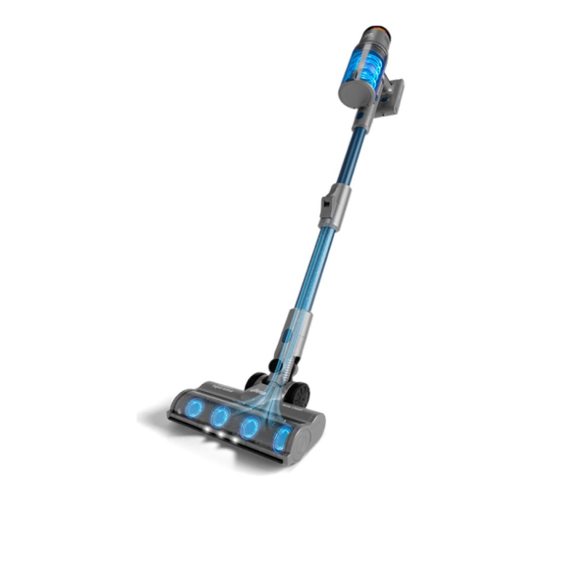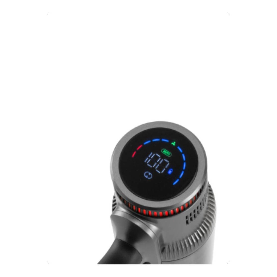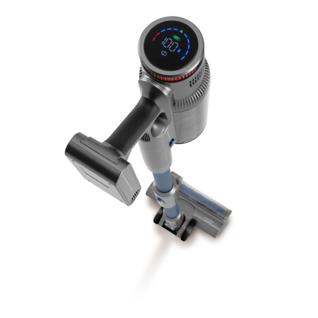 El cepillo motorizado con luz Power Led atrapa toda la suciedad de forma eficiente, y la pantalla digital táctil proporciona una interfaz intuitiva para seleccionar el modo de trabajo y visualizar la carga restante de la batería.