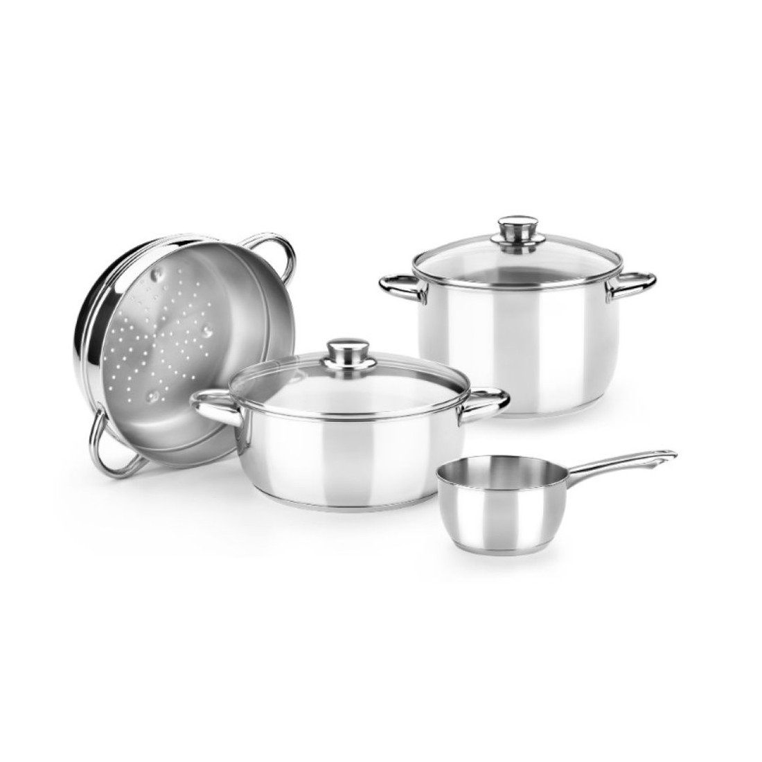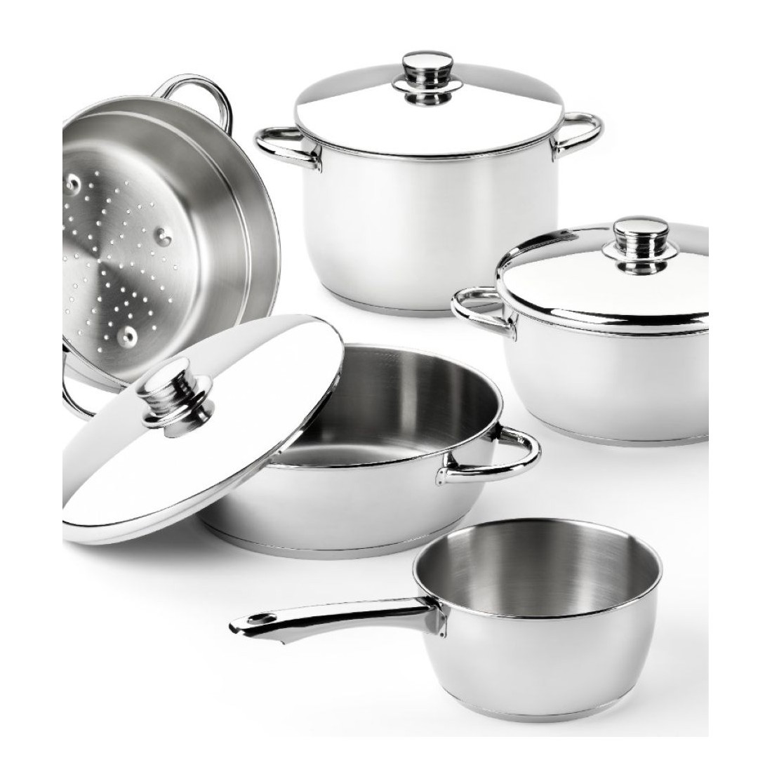 Este juego de cazuelas ha sido diseñado para ofrecer resistencia y elegancia en cada preparación. Fabricado completamente en acero inoxidable, combina una estética brillante con la robustez necesaria para el uso diario. Las tapas a juego garantizan un sellado perfecto y una cocción más eficiente.