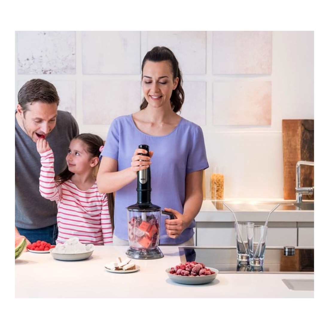 Este modelo incluye una picadora de 0,35 litros, un vaso medidor de 600 ml y un accesorio de varillas, lo que permite adaptarlo a diferentes necesidades sin ocupar demasiado espacio. La picadora es ideal para frutos secos, quesos duros o verduras que quieras dejar finas en segundos, mientras que las varillas funcionan muy bien para montar nata, batir huevos o airear masas ligeras. Todos los elementos se conectan mediante el sistema EasyClick Plus, que encaja con firmeza sin requerir fuerza excesiva. Tener varias funciones en un solo aparato resulta especialmente útil para quienes buscan ahorrar tiempo y evitar múltiples electrodomésticos.