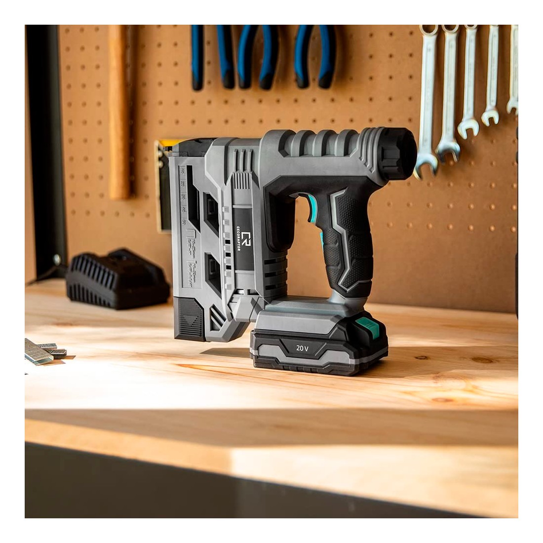Grapadora de batería de 20 V y 2.000 mAh, velocidad de trabajo de 30 disparos por minuto, con capacidad para 100 grapas del tipo 55, de entre 15 y 25 mm de longitud, o 50 clavos del tipo 47, de longitudes 15, 20, 25 o 32 mm.