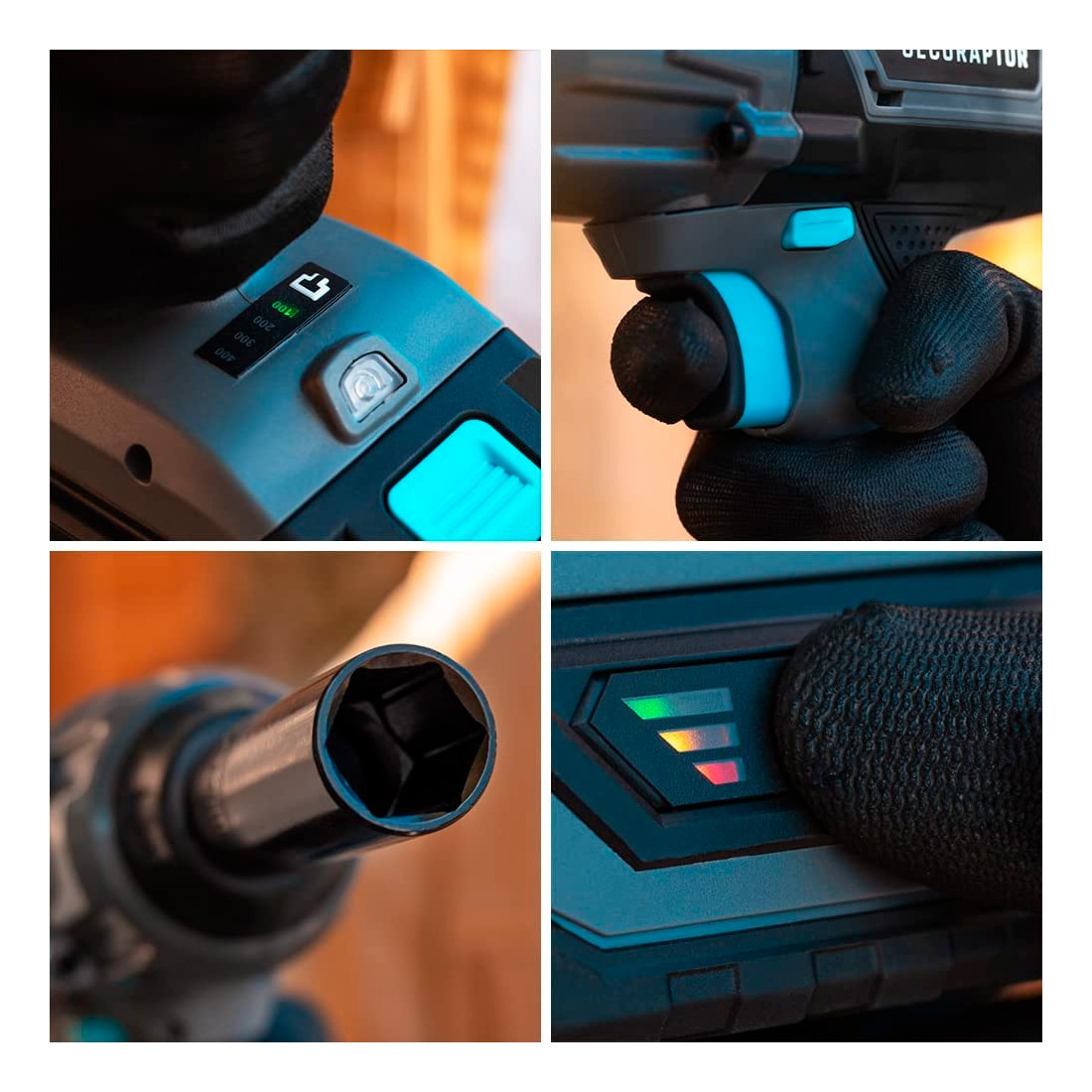 Torque máximo de 400 Nm, con 4 posiciones que permiten seleccionar la potencia en 100 Nm, 200 Nm, 300 Nm y 400 Nm. Con sus indicadores led incorporados podrás conocer qué potencia se encuentra seleccionada en la llave de impacto, con la que podrás realizar de forma rápida y efectiva todos tus trabajos.