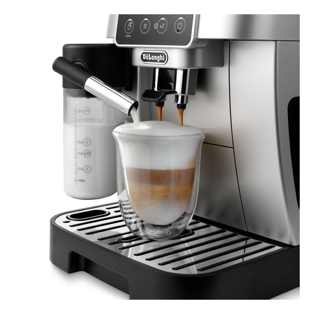 Gracias a su molinillo integrado y la presión de 15 bares, cada taza se elabora con café recién molido, logrando una extracción perfecta y una crema inigualable. Si te gustan las bebidas con leche, el espumador incorporado crea texturas suaves para cappuccinos y lattes, como en una cafetería profesional.