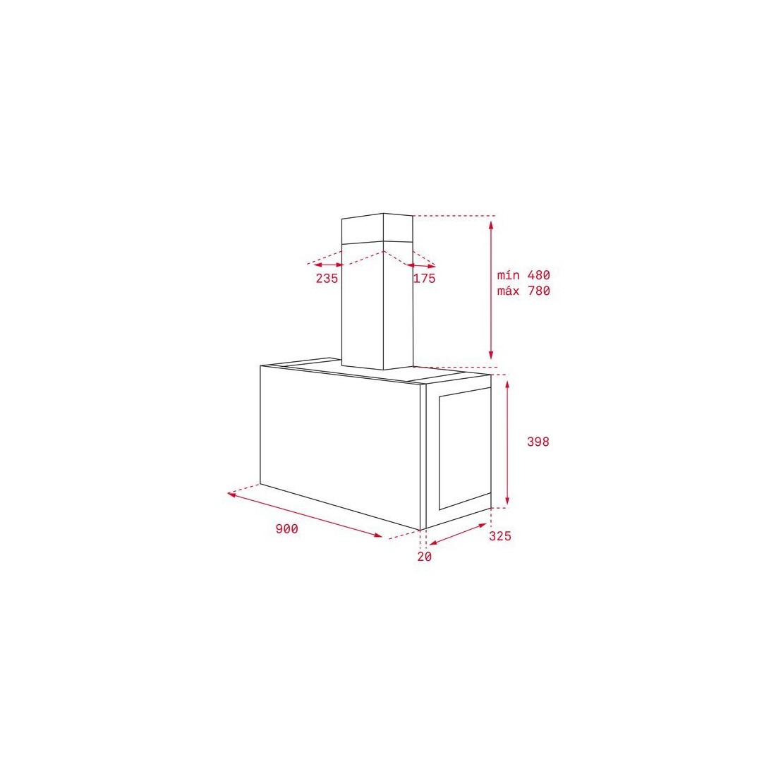 Las medidas de esta campana son 900 mm de ancho, 325 mm de profundidad y 398 mm de altura. La altura total puede ajustarse entre 48 y 78 cm, lo que facilita su instalación en distintos espacios.