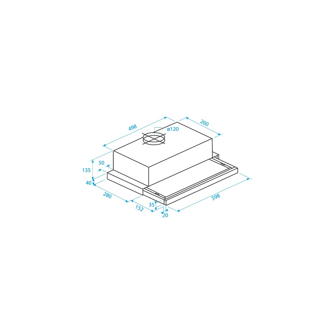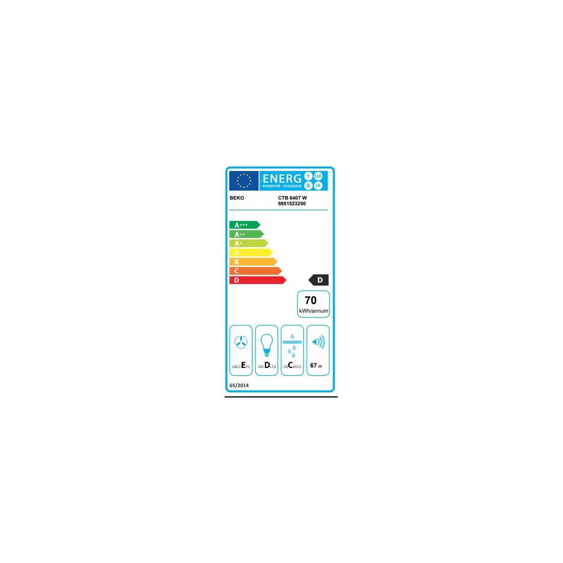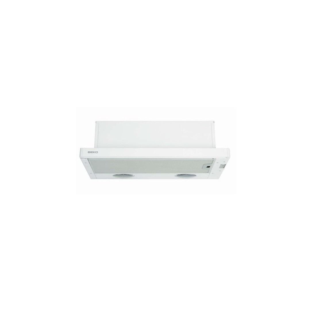 Beko CTB 6407 W. Tipo de extracción: Canalizado, Máxima capacidad de extracción: 280 m³/h, Nivel de ruido (baja velocidad): 52 Db. Tipo: Semi built-in (pull out), Color del producto: Color blanco, Tipo de control: Barra de desplazamiento. Tipo de filtro de grasa: Aluminio, Número de filtros: 2 piezas. Potencia del motor: 135W, Potencia de lámpara: 20W. Ancho: 59.8 cm, Profundidad: 28 cm, Altura: 17.5 cm