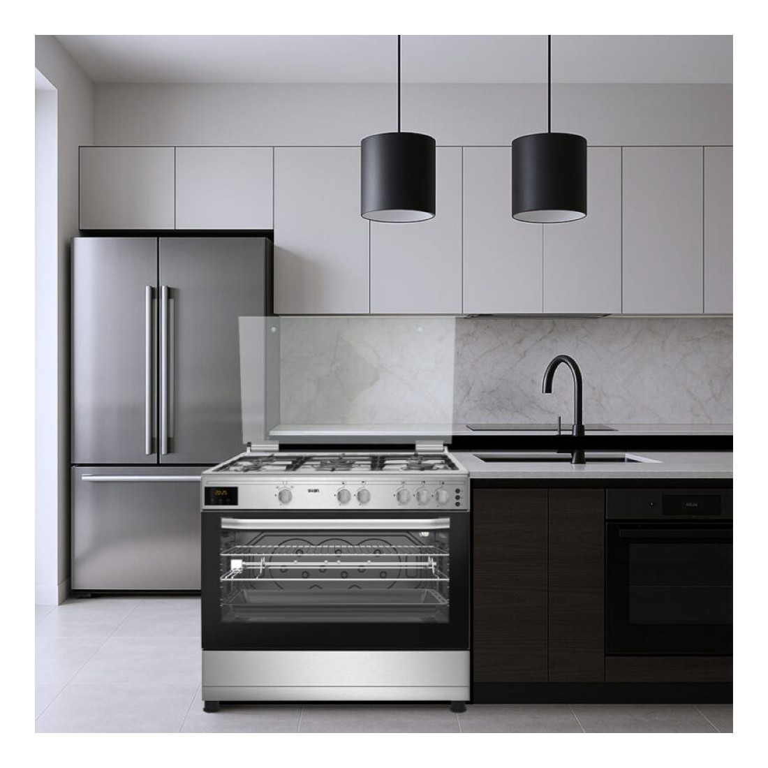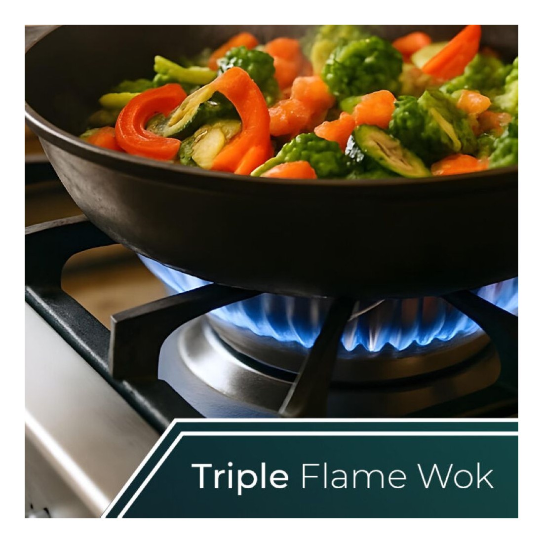 Esta cocina de gas combina un diseño elegante en acero inoxidable con prestaciones pensadas para facilitar tu día a día. Con cinco zonas de cocción y un quemador Wok de triple llama, podrás preparar platos rápidos y sabrosos sin renunciar a la calidad. Su tapa de cristal abatible protege la placa y aporta un toque sofisticado cuando no está en uso.