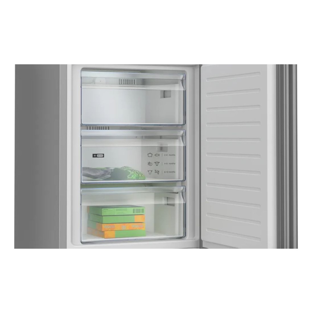 Con 321 litros de capacidad total, este frigorífico ofrece organización inteligente: botellero cromado, baldas extraíbles y tres cajones en el congelador para todo tipo de productos.