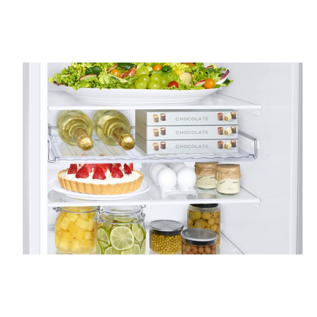 Gracias a SpaceMax™, se gana espacio útil sin aumentar las dimensiones externas del electrodoméstico. Además, cuenta con una balda de gran tamaño en la puerta que permite almacenar botellas de hasta 2 litros cómodamente. Su diseño interior minimalista incluye una cava para vinos y una pantalla oculta que complementan su estilo elegante.