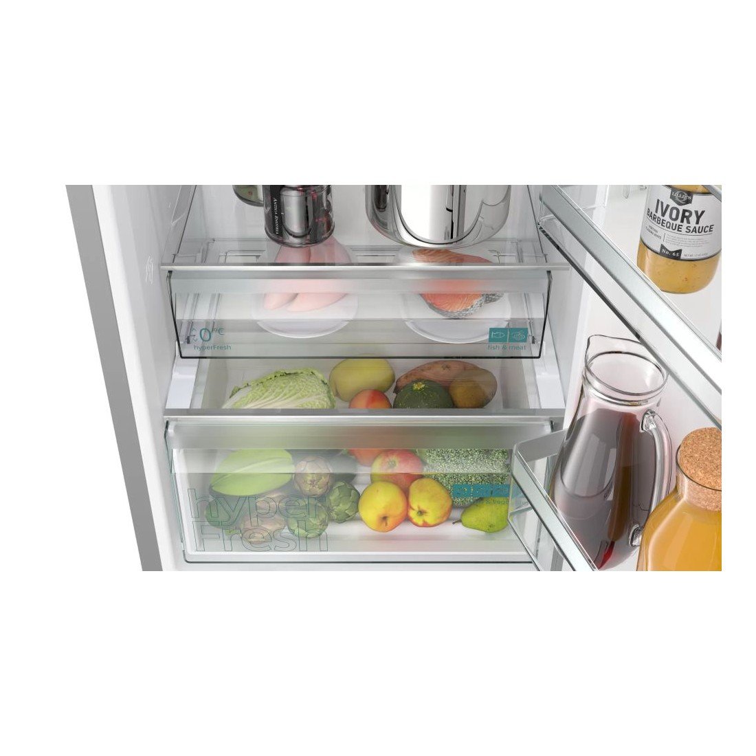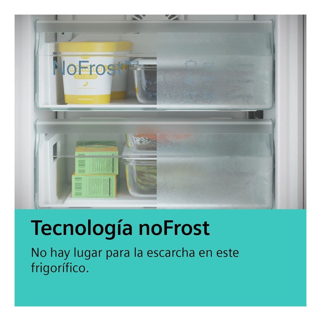 Este frigorífico combi en acero inoxidable incorpora la tecnología No Frost, que evita la formación de hielo en el interior. Esto significa que no tendrás que descongelarlo nunca, lo que ahorra tiempo y energía. Además, el aire seco circula constantemente, manteniendo los alimentos en condiciones óptimas durante más tiempo.