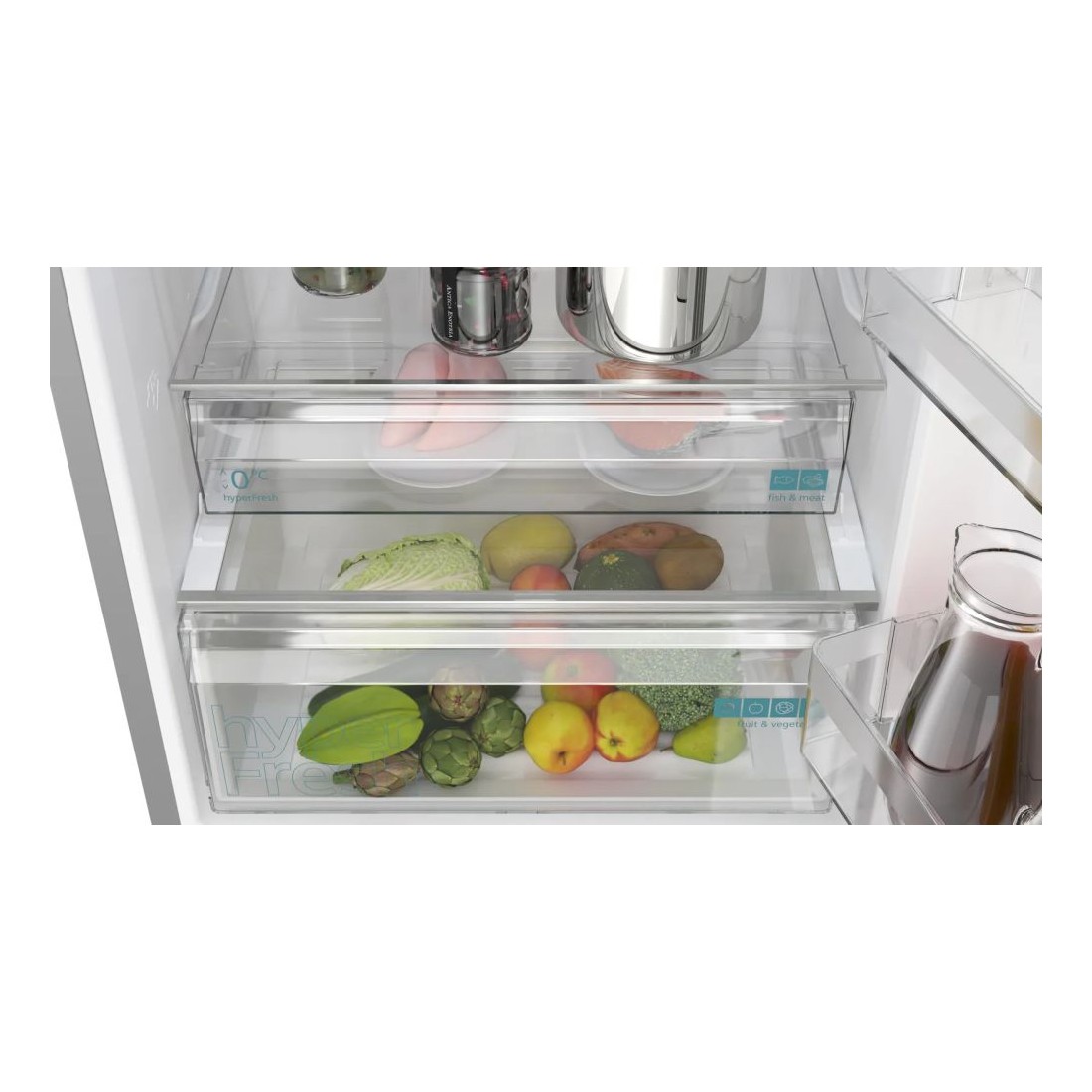 Con una capacidad total de 440 litros, este modelo ofrece espacio más que suficiente para almacenar alimentos frescos y congelados. El frigorífico cuenta con 311 litros distribuidos en cinco compartimentos, incluyendo un cajón para verduras y una zona fresca para carnes y pescados. El congelador, situado en la parte inferior, dispone de 129 litros útiles repartidos en tres cajones, lo que permite organizar los productos congelados de forma cómoda y accesible.