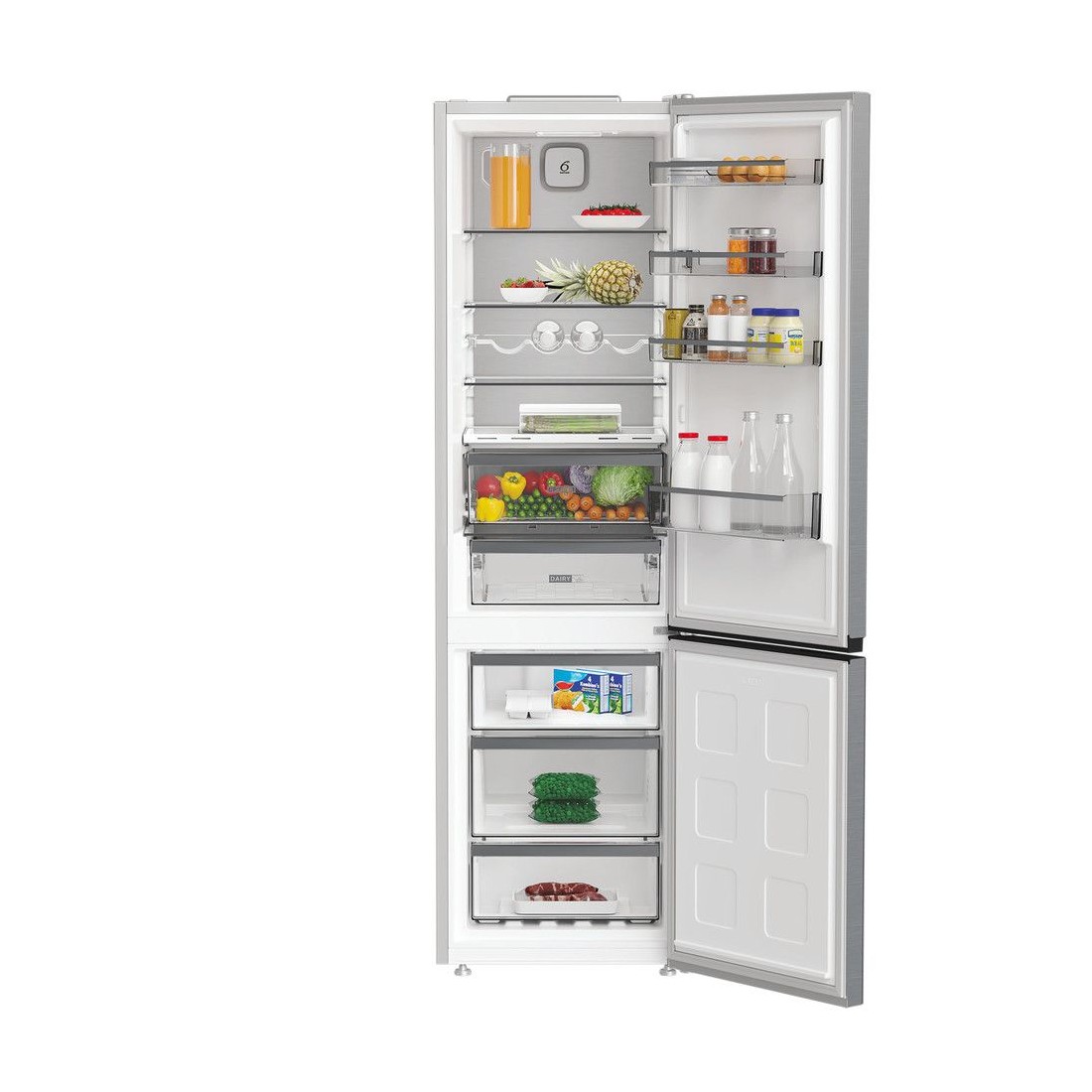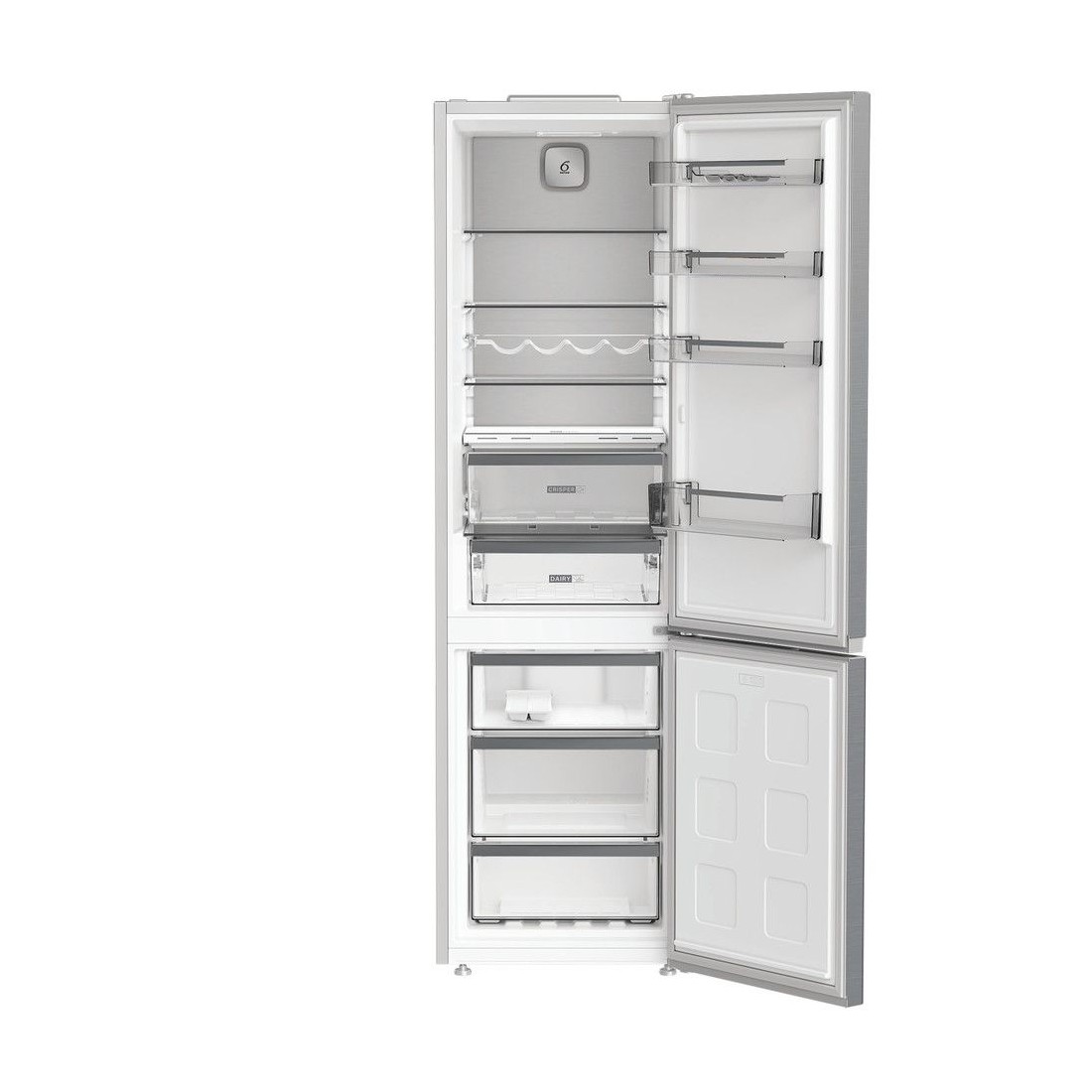 Este frigorífico combinado destaca por su diseño moderno en color Pearl Inox y un amplio espacio de almacenamiento con una capacidad total de 355 litros, ideal para familias que necesitan organización y eficiencia. Una solución ideal para cocinas contemporáneas que buscan funcionalidad con estética.