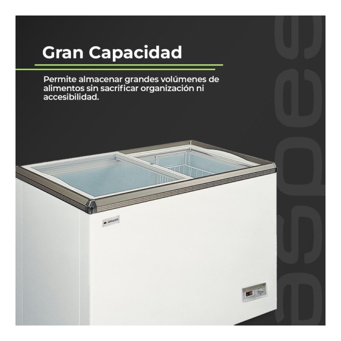 Con un nivel sonoro máximo de 52 dB, este arcón congelador trabaja de forma discreta. Además, incorpora cierre seguro y mantiene los alimentos congelados hasta 9 horas en caso de fallo eléctrico, una tranquilidad extra para tu hogar o negocio.