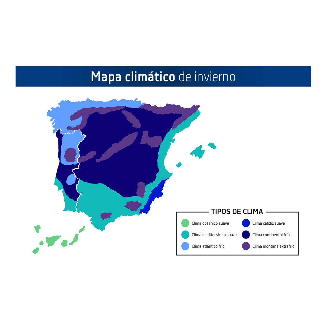 En el mapa que te mostramos a continuación, puedes consultar el tipo de clima que hay según la zona en la que vivas, y con la tabla inferior te establecemos una relación entre los metros cuadrados de tu estancia y el clima; pudiendo así elegir el modelo de emisor térmico Orbegozo adecuado con total garant