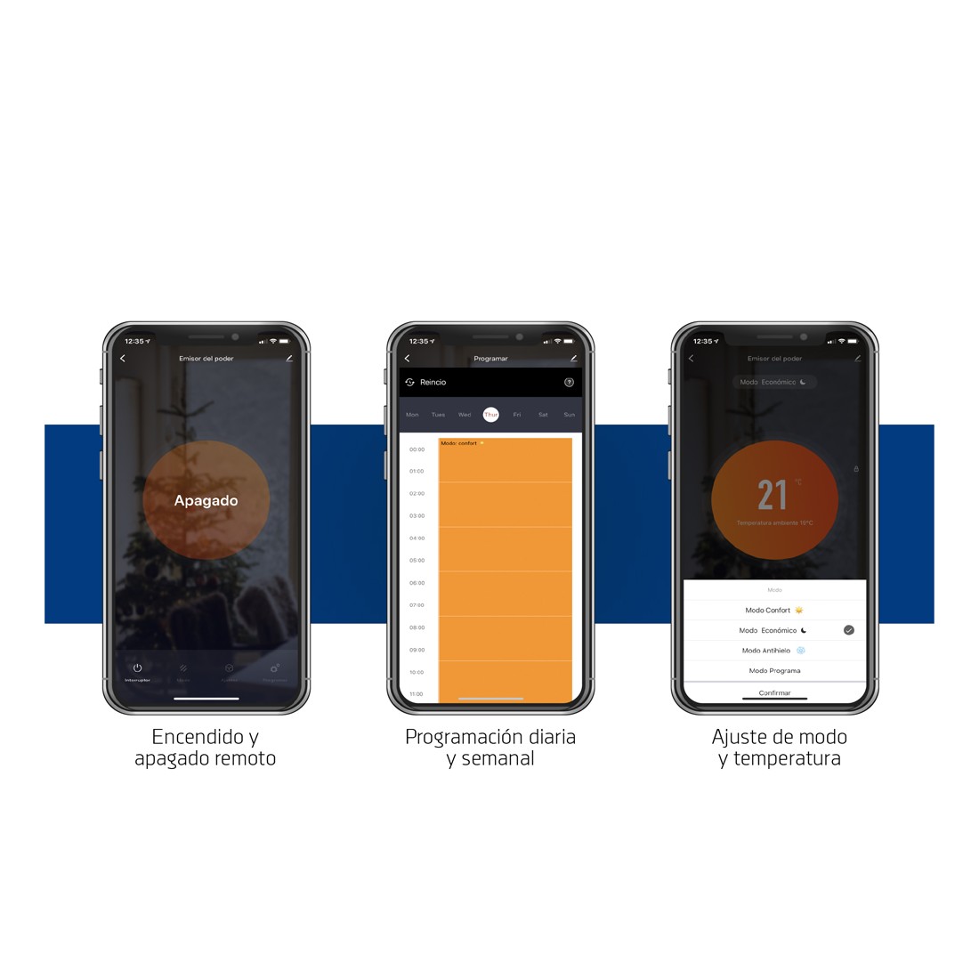 Emisor térmico de bajo consumo Wi-Fi y programable. Cuenta con 1800 W de potencia, display digital LCD y conexión inalámbrica mediante Orbegozo APP.