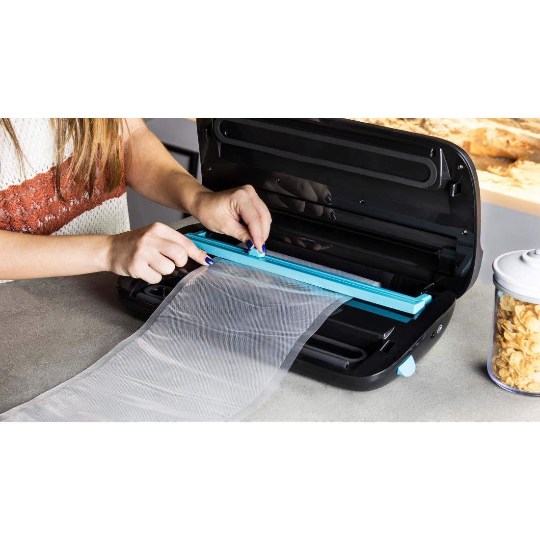 Envasadora de alimentos al vacío que vacía y sella para conservar ingredientes y comidas preparadas frescas hasta 5 veces más tiempo.