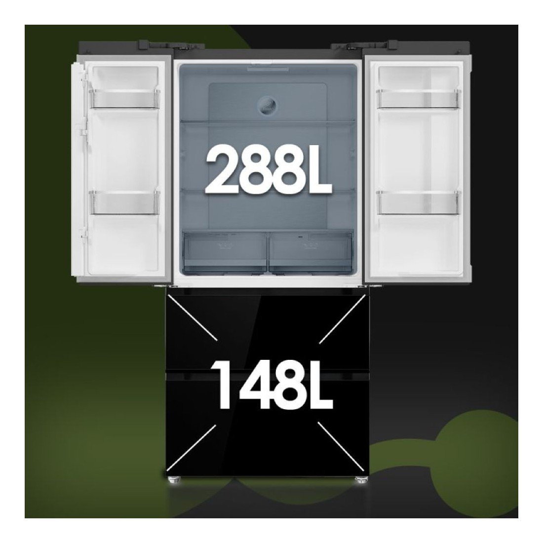 Este frigorífico de color cristal negro no solo destaca por su apariencia sofisticada, sino también por su capacidad para adaptarse a cualquier cocina gracias a su sistema de apertura Zero Clearance. Las puertas se abren a 90º sin necesidad de dejar espacio lateral, lo que facilita su instalación incluso en rincones ajustados.