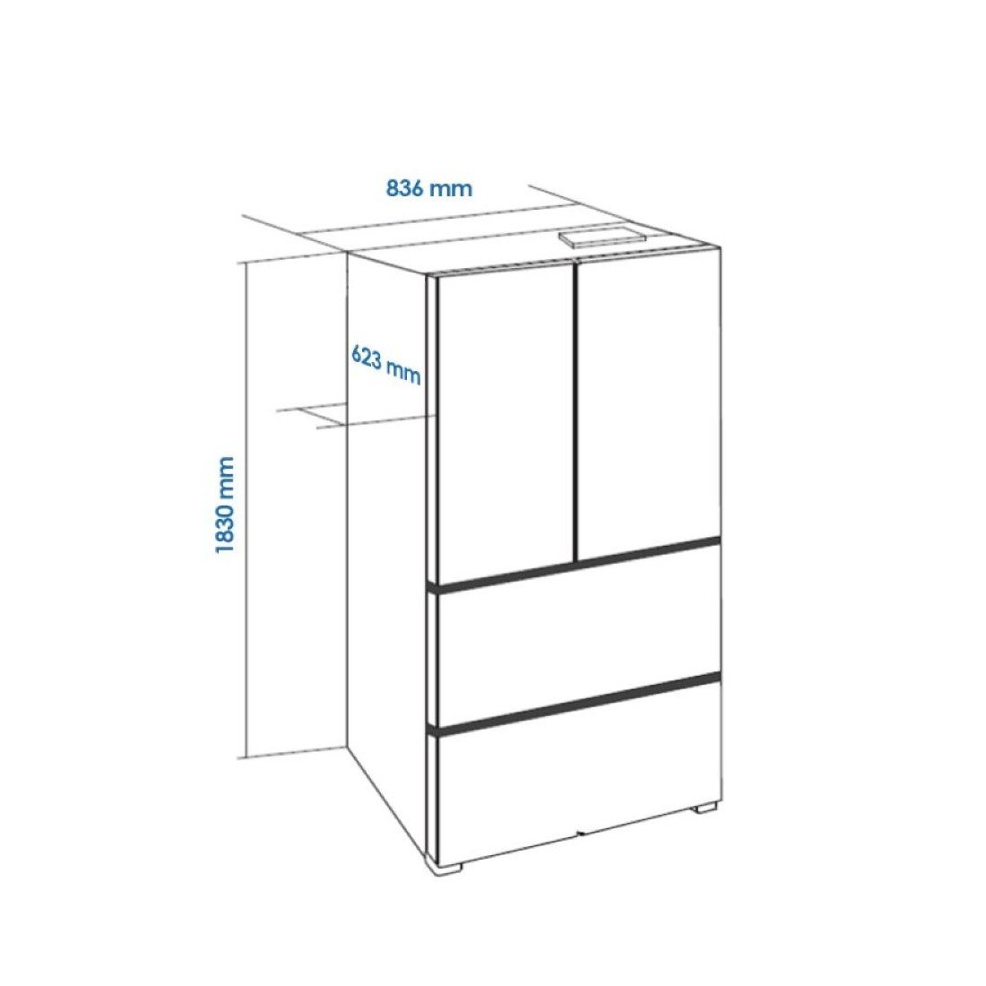 Las dimensiones del frigorífico son 1830 mm de alto, 836 mm de ancho y 623 mm de fondo. Estas medidas lo convierten en una opción versátil para cocinas modernas que buscan funcionalidad sin renunciar al diseño.