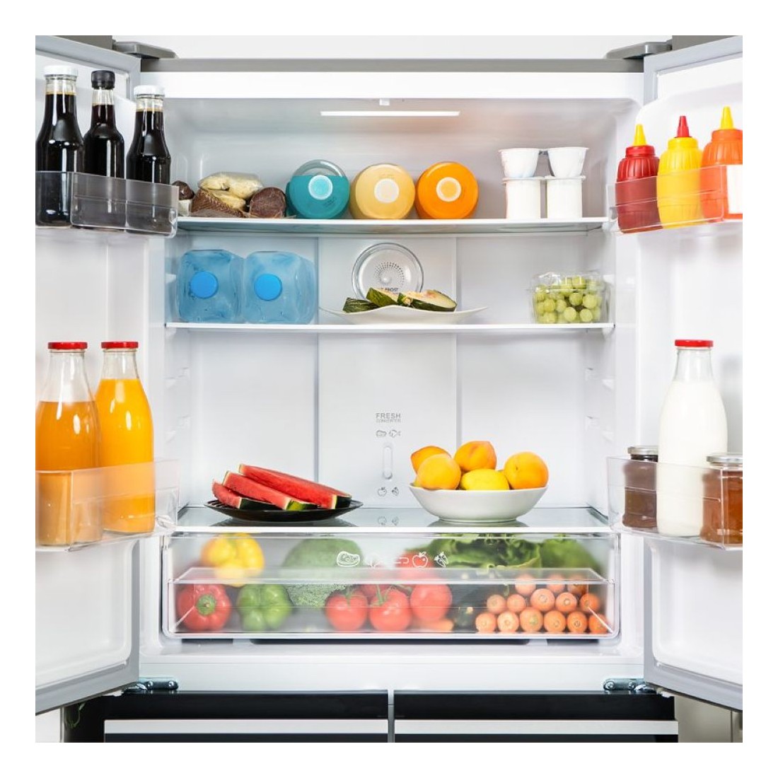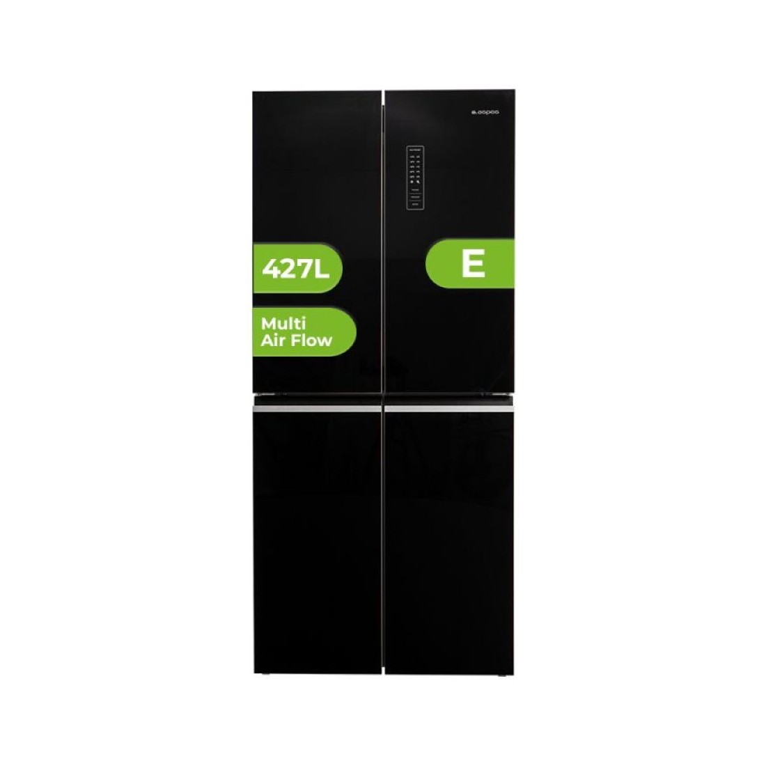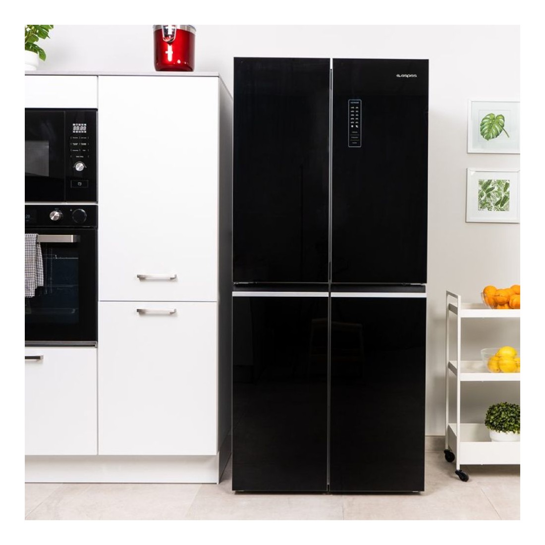 Este frigorífico de 4 puertas combina un acabado en cristal negro con líneas modernas y funcionales. Su estética encaja perfectamente en cocinas contemporáneas, aportando un toque de distinción sin renunciar a la practicidad. Las puertas tipo uñero, no reversibles, ofrecen una apertura cómoda y sin elementos sobresalientes.