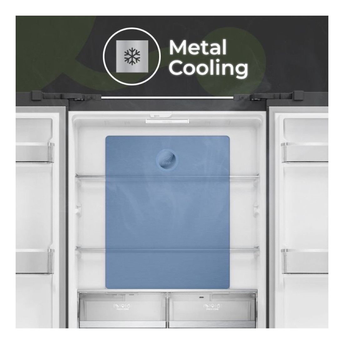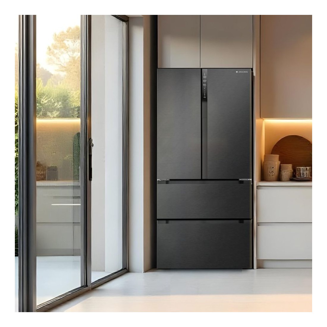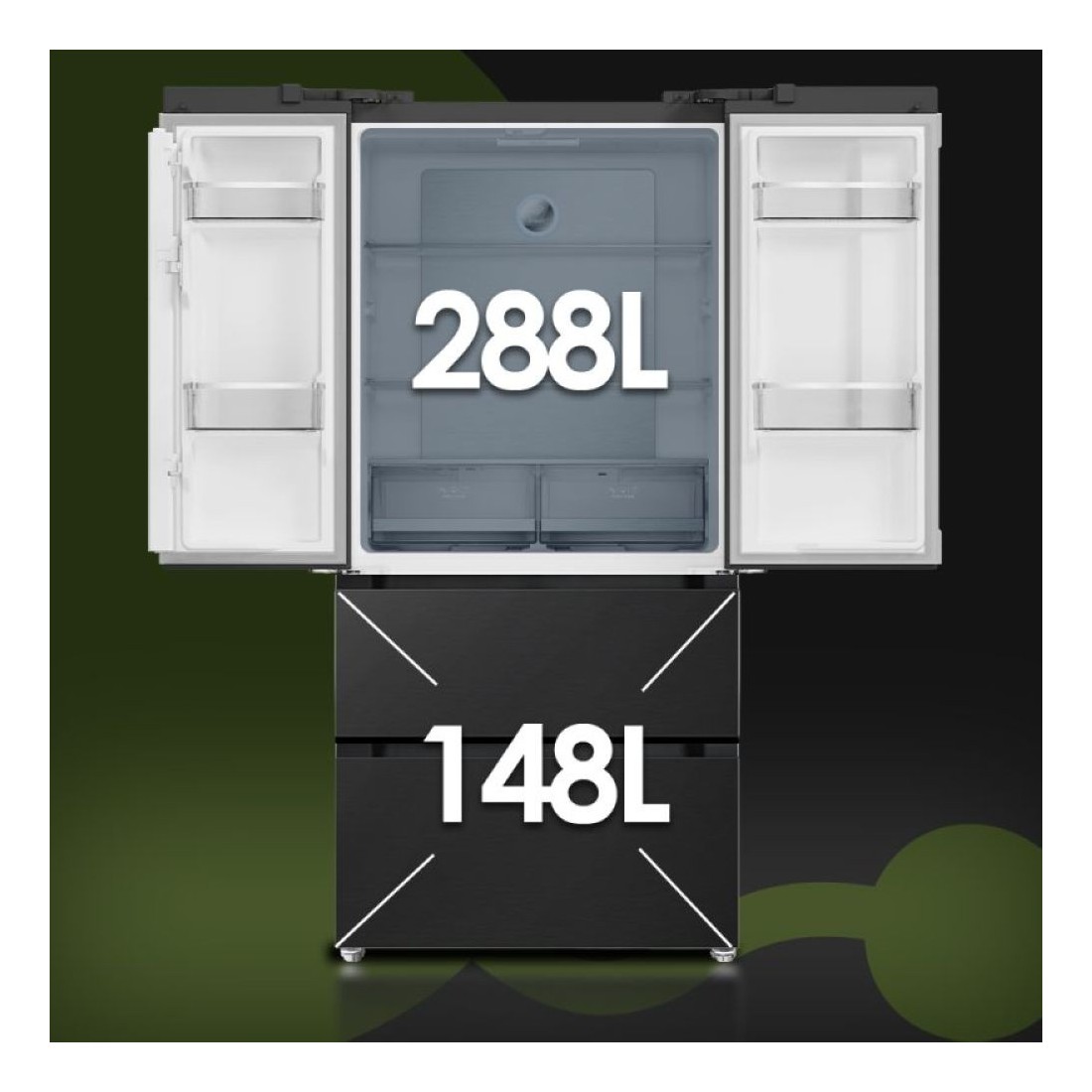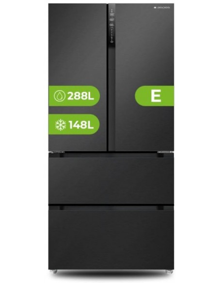 Este frigorífico de puertas francesas ofrece una capacidad total de 436 litros, ideal para familias que necesitan espacio y orden. Sus cuatro puertas permiten distribuir los alimentos de forma cómoda, mientras que los cajones para verduras y los estantes en la puerta facilitan el acceso a todo lo que necesitas.