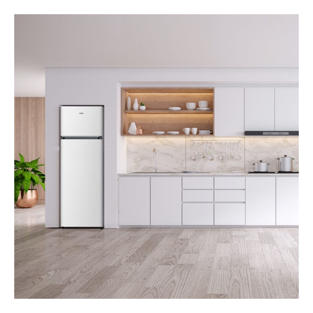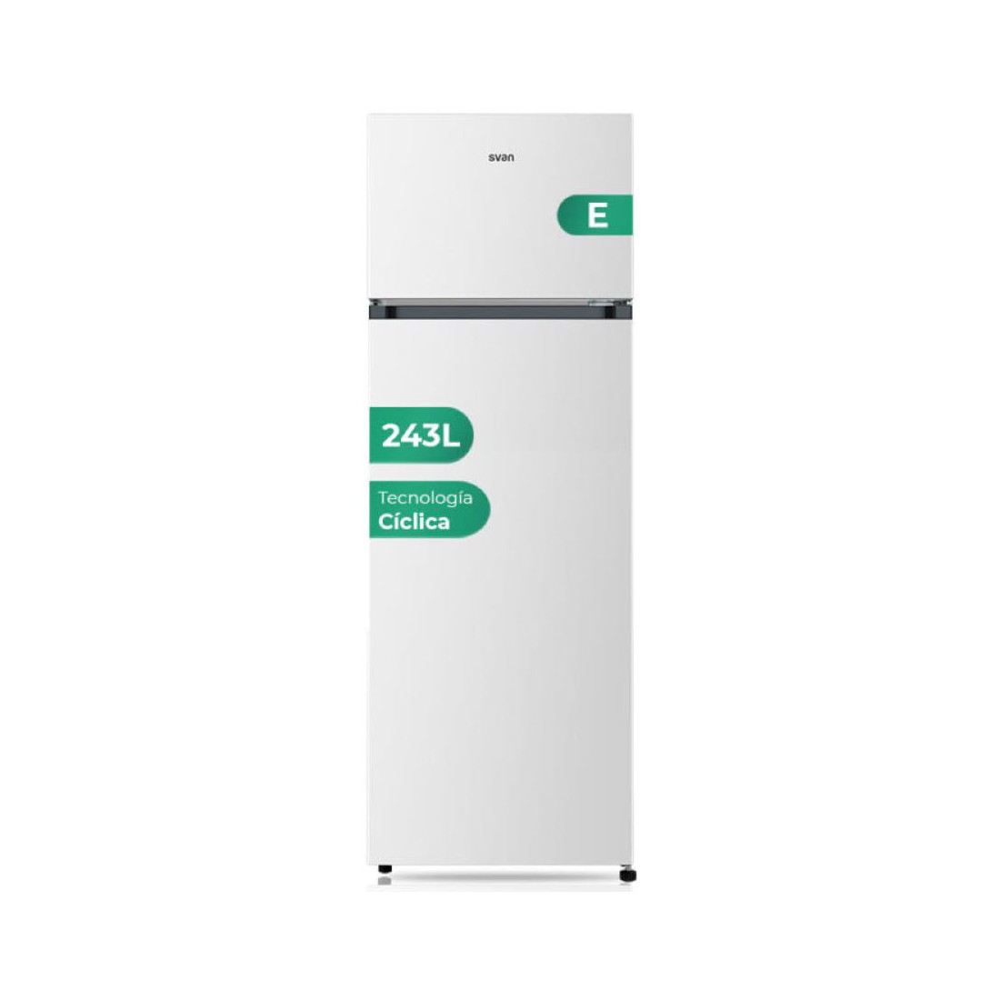 Este frigorífico blanco de dos puertas destaca por su estética sencilla y práctica. Con una capacidad total de 243 litros, ofrece espacio suficiente para organizar tus alimentos sin complicaciones.