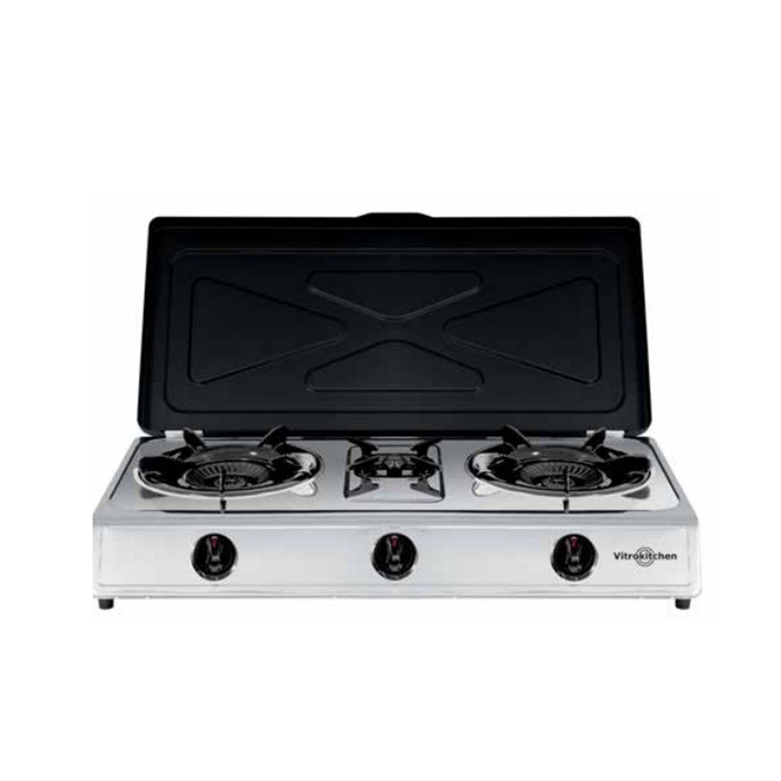 | Tapa metálica pintada en negro | 3 Quemadores con 2 Quemadores de acero inoxidable de alta potencia |