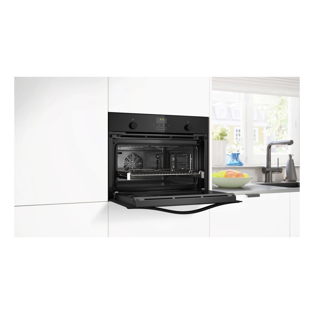 Este horno compacto de 45 cm es la opción ideal para quienes desean combinar estética moderna con funcionalidades completas. Su acabado en cristal negro y controles táctiles lo hacen perfecto para cocinas contemporáneas. Gracias a sus 7 funciones de cocción, entre ellas Aire caliente 3D y Turbo grill, cada receta alcanza un resultado profesional con mínima intervención.