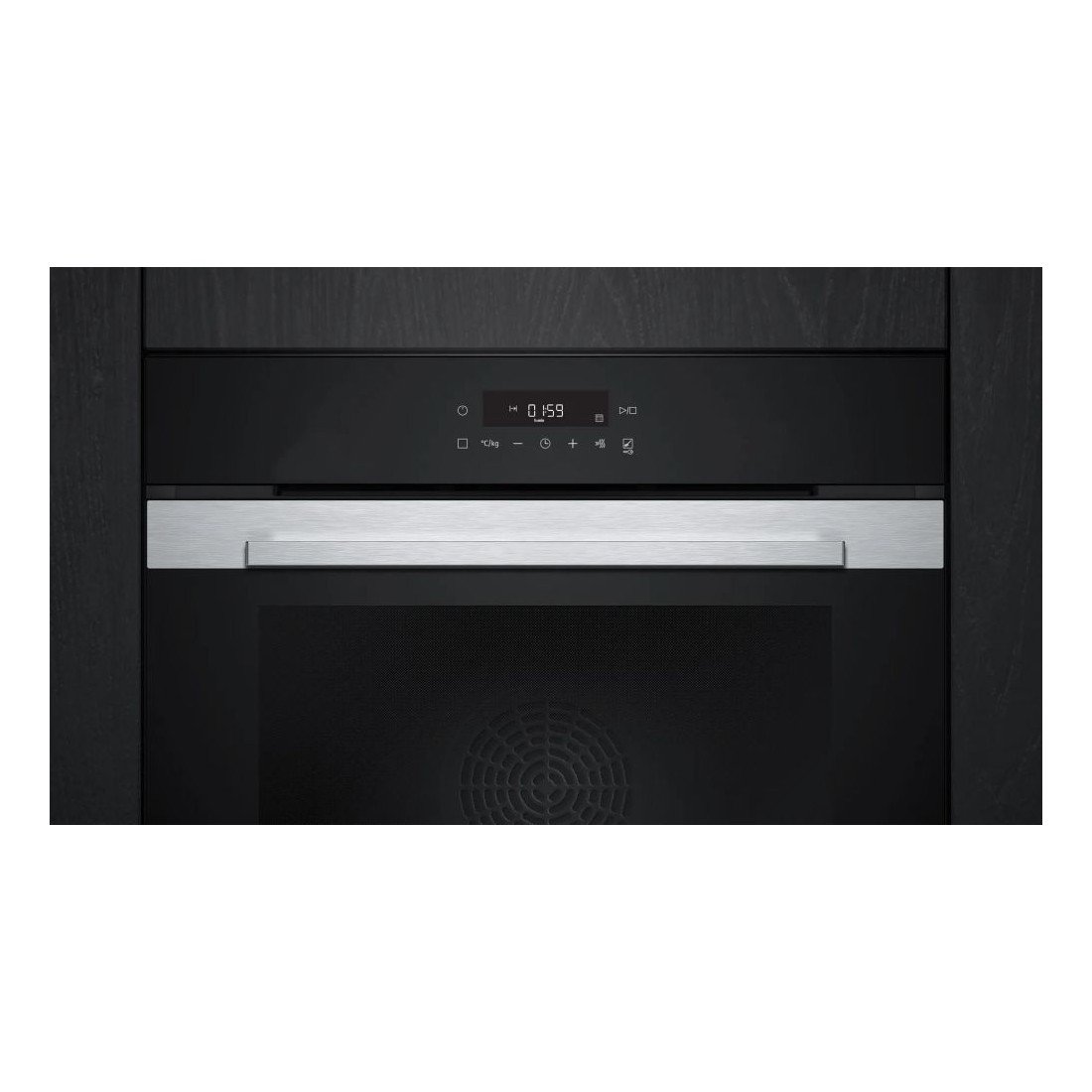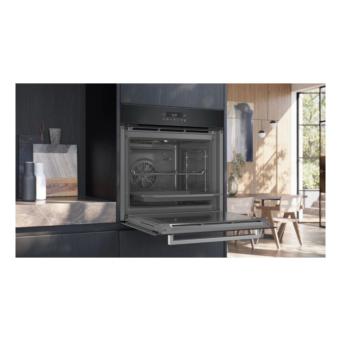 Este horno eléctrico en negro y acero inoxidable combina estética y funcionalidad. Su panel frontal de vidrio con control táctil y pantalla LED ofrece una experiencia de uso intuitiva y sin botones físicos. Ideal para cocinas modernas que buscan líneas limpias y tecnología avanzada.