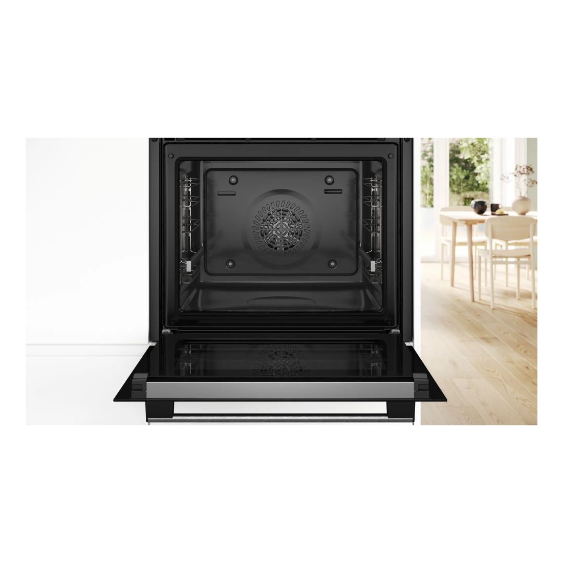 Con un acabado en negro y acero inoxidable, este horno aporta un toque moderno a cualquier cocina. Sus mandos ocultables y pantalla LED ofrecen un manejo intuitivo, y la guía telescópica facilita la extracción de bandejas calientes.