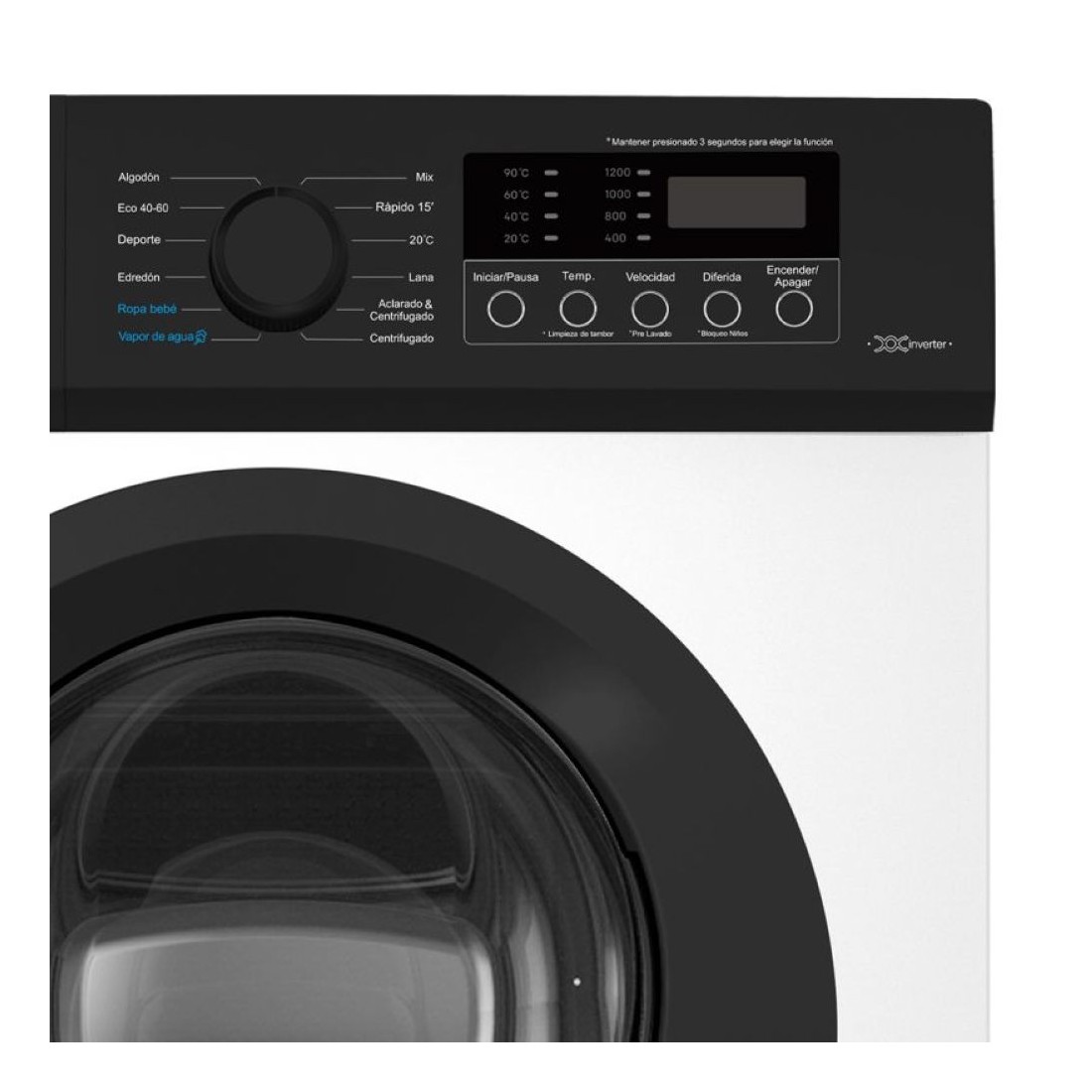 Cuenta con 12 programas de lavado que incluyen opciones para ropa delicada, deportiva, sintética y más. La función vapor ayuda a eliminar olores y arrugas, mientras que el sistema de limpieza interior mantiene el tambor libre de residuos, prolongando su vida útil.