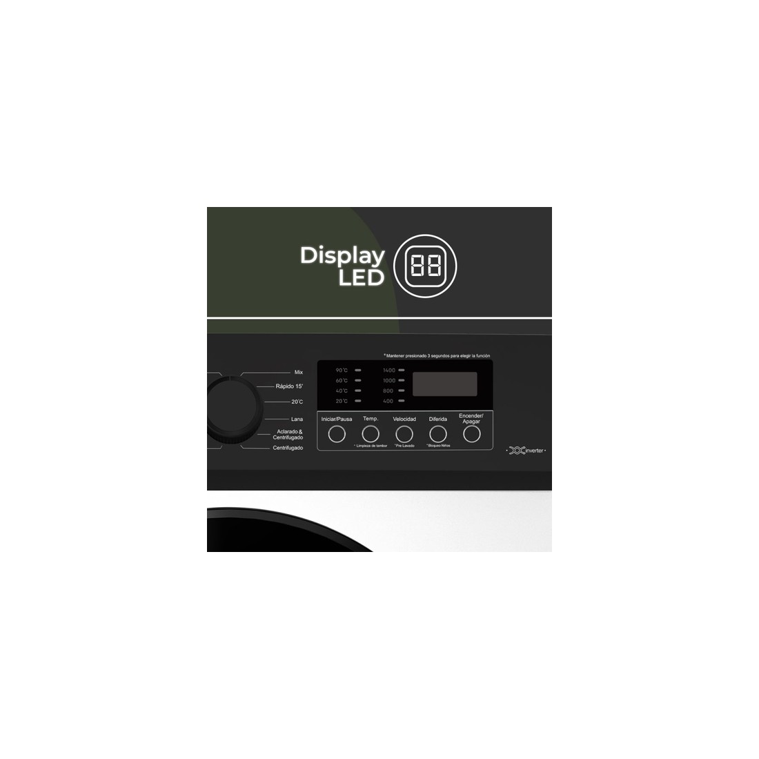 El acabado en color blanco con puerta oscura aporta un estilo moderno. Su Display LED permite controlar y ajustar cada ciclo de forma intuitiva.
