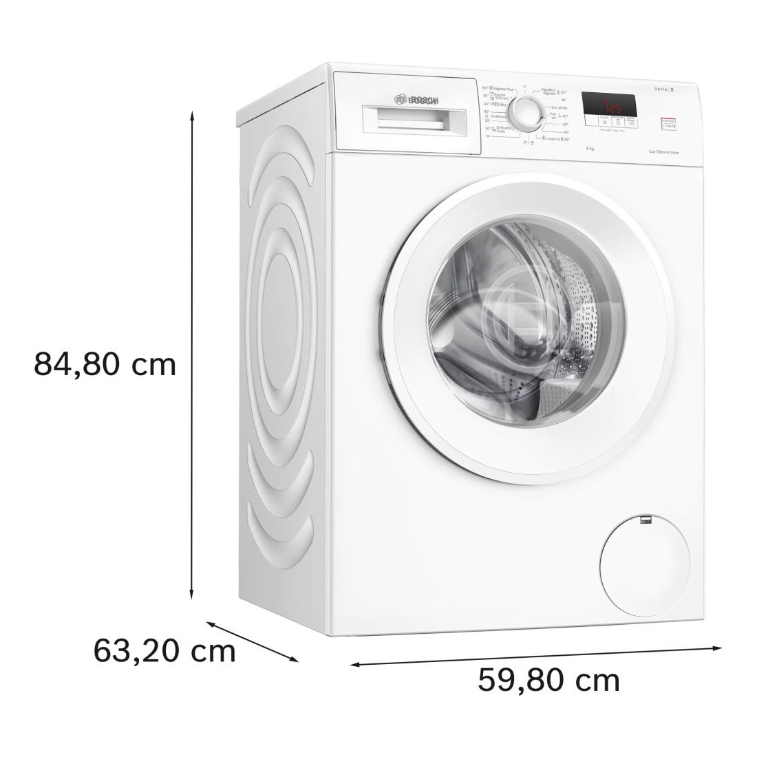 Altura: 848 mm – Anchura: 598 mm – Fondo: 588 mm. Volumen del tambor: 65 litros.