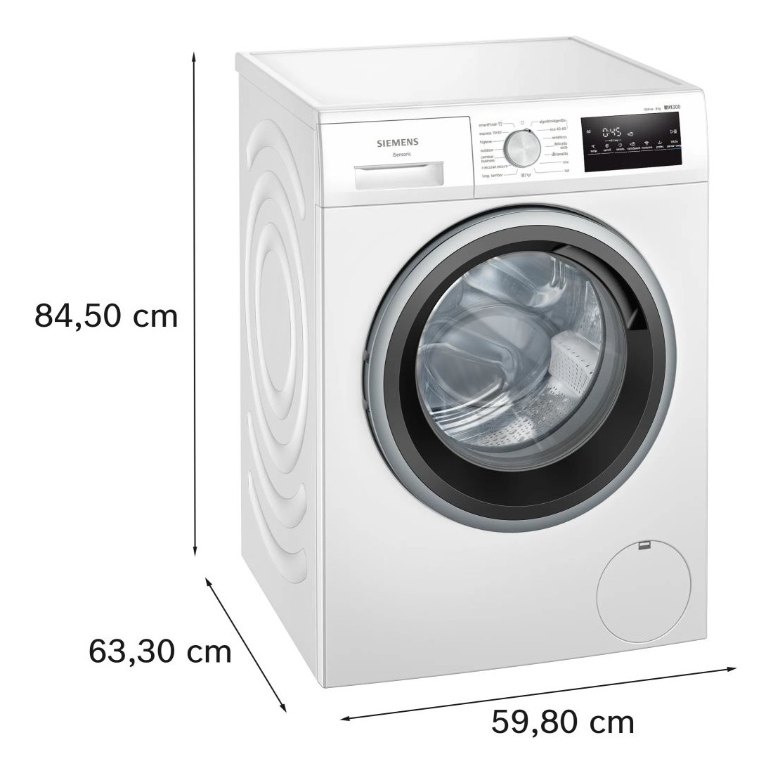 La lavadora tiene un ancho de 598 mm, una profundidad de 550 mm y una altura de 848 mm. Con la puerta abierta, alcanza una profundidad de 1017 mm. Su peso es de 67,9 kg.