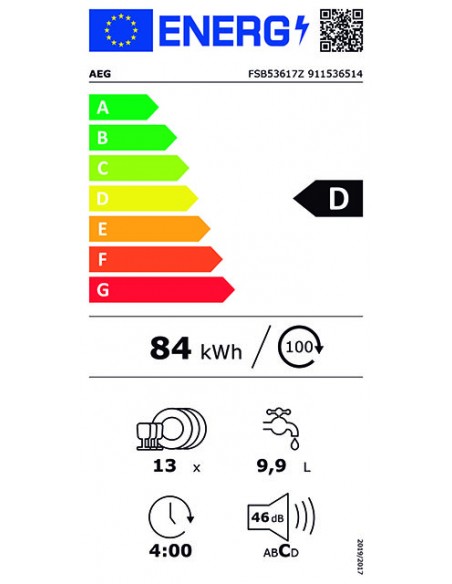 Lavavajillas Integrable de AEG con una anchura de 60cm; capacidad para 13 cubiertos; eficiencia D y un nivel sonoro de 46 dB.