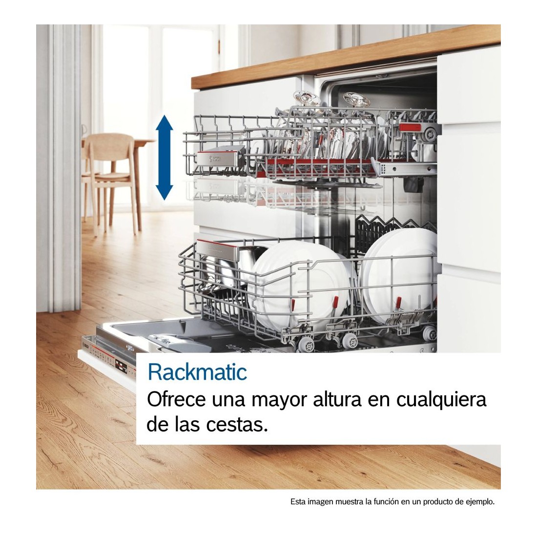 Incluye cestas Vario y una tercera bandeja VarioDrawer para cubiertos, liberando espacio en la cesta inferior para ollas y platos grandes. Además, el sistema RackMatic permite ajustar la altura de la cesta superior en tres niveles, incluso cuando está cargada.