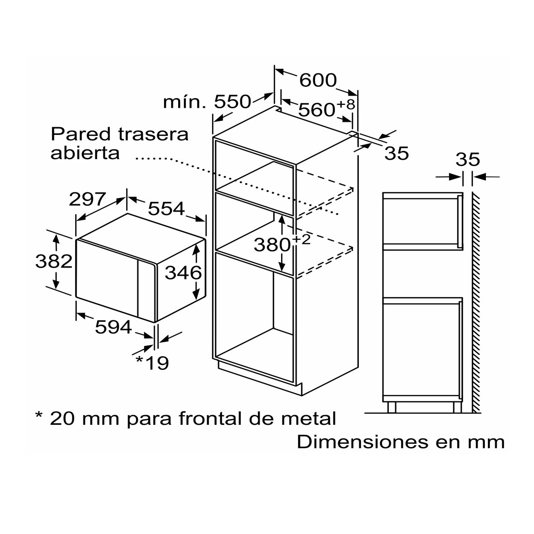 Microondas Integrable de 60 x 38 cm y 800w de potencia. Dispone de un grill con 1000W de máxima potencia.