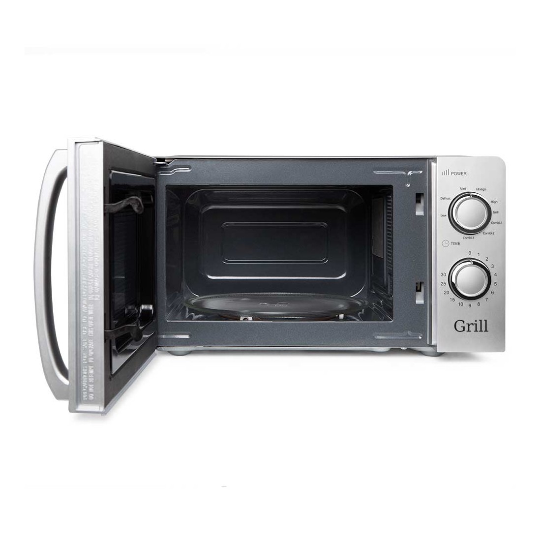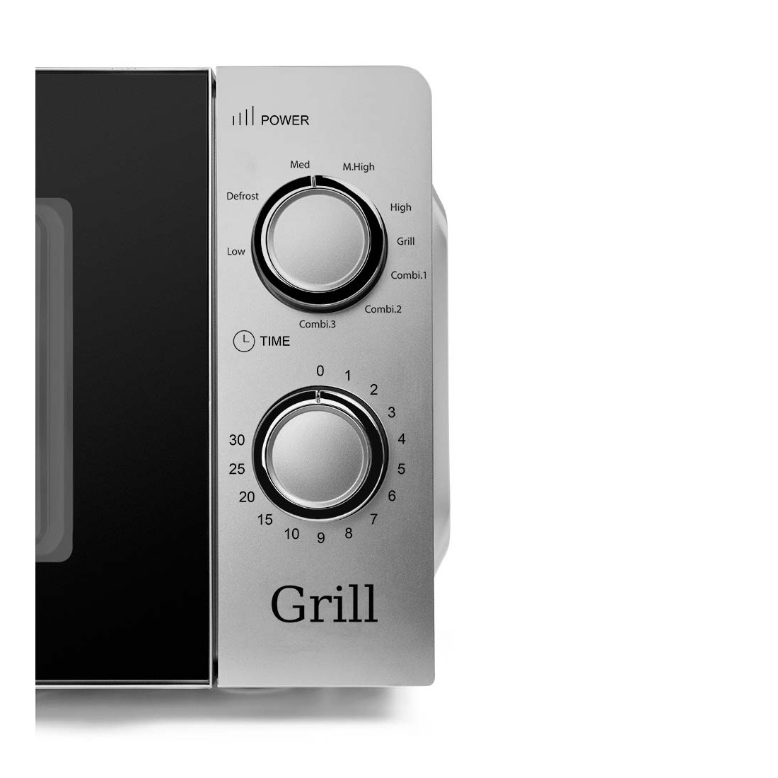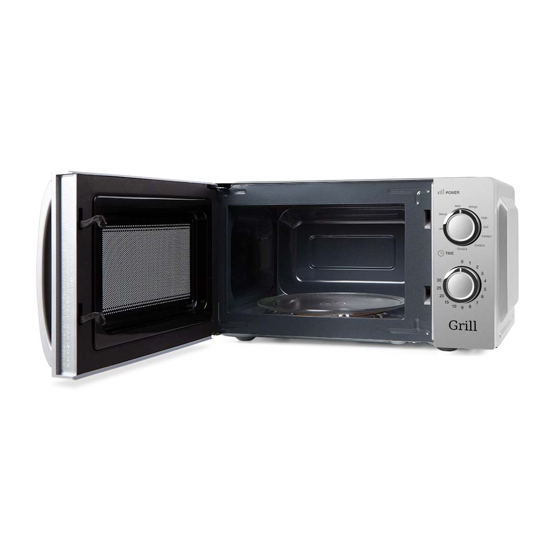 Microondas con una capacidad de 20 litros; cinco niveles de potencia; grill incorporado y 700w de potencia. Color plata.