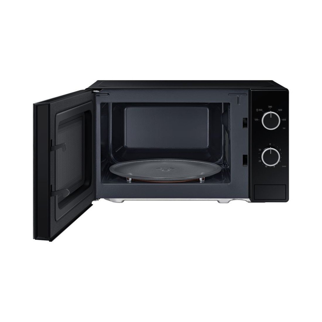 El microondas cuenta con una puerta de cristal negra que cubre todo el frontal, proporcionando un look minimalista y premium. El borde metálico en los diales duales añade un toque sofisticado y elegante.