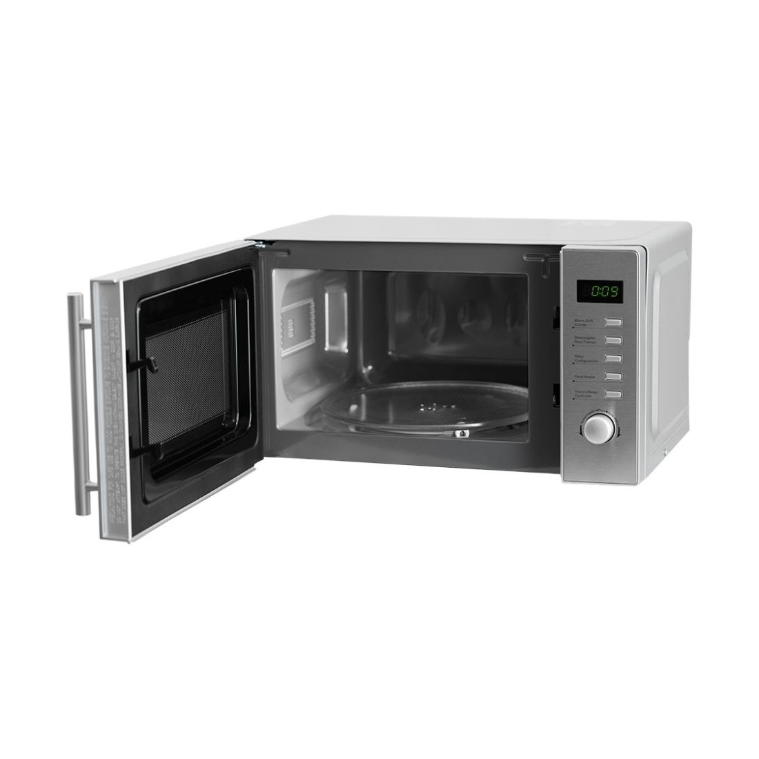 Su plato giratorio de 25,5 cm asegura una cocción uniforme, mientras que la luz interior permite controlar el estado de los alimentos sin abrir la puerta. La apertura lateral mediante botón y la bisagra a la izquierda facilitan el acceso incluso en espacios reducidos. Todo pensado para que cocinar sea más cómodo y seguro.
