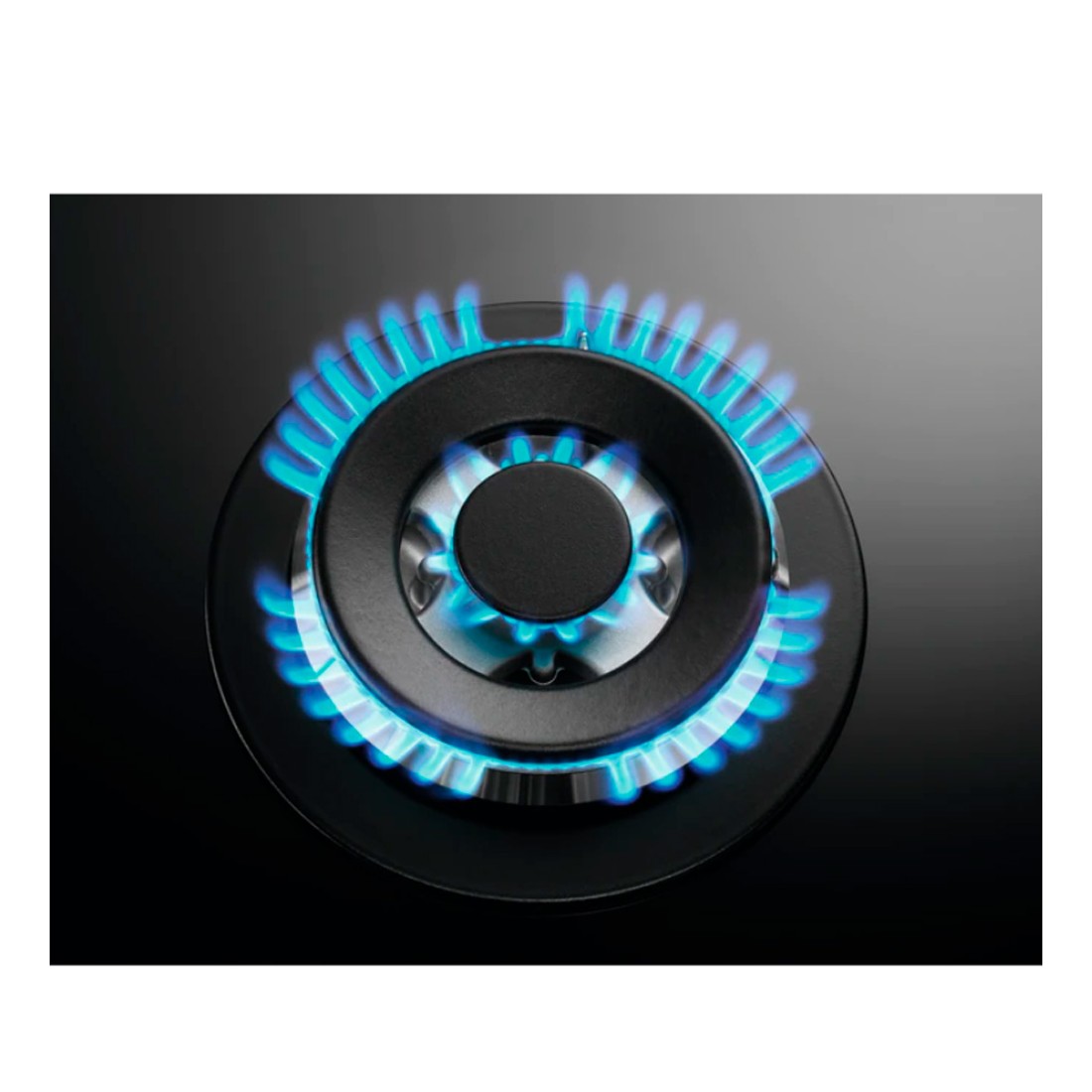 Placa de Gas con 3 quemadores SpeedBurner (1 quemador Wok), panel de control frontal con indicadores LED de encendido y parrillas de hierro fundido.