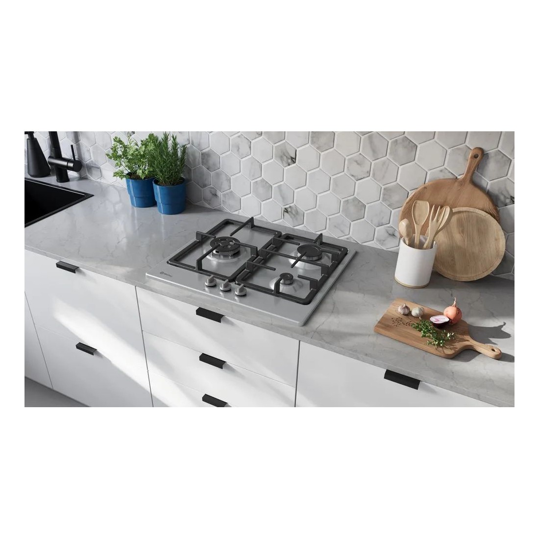 Esta placa de gas combina tres fuegos bien distribuidos y una superficie de acero inoxidable que encaja en cualquier cocina moderna. El quemador izquierdo es de tipo Wok, perfecto para quienes buscan un extra de potencia en preparaciones rápidas o salteados intensos. Además, el encendido automático en cada mando facilita el uso diario sin necesidad de accesorios externos. Su diseño integrado ayuda a aprovechar mejor el espacio sin renunciar a prestaciones profesionales.