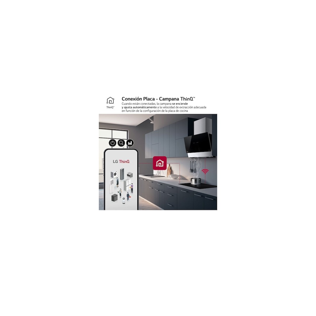 Gracias a la app LG ThinQ™, podrás controlar la placa desde tu móvil y sincronizarla con la campana para que se ajuste automáticamente.