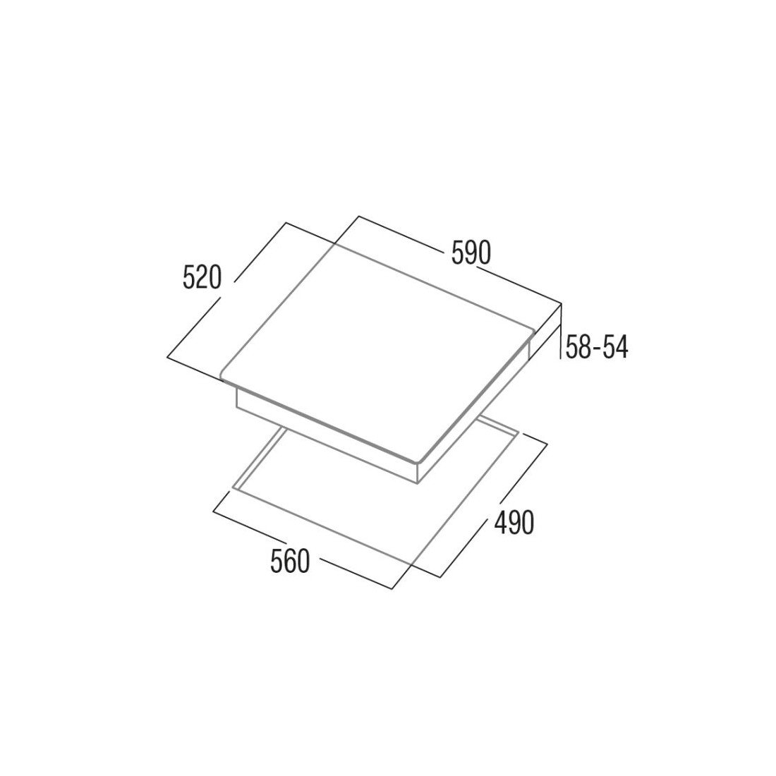 Anchura: 590 mm – Altura: 58 mm – Profundidad: 520 mm – Altura empotrada: 50 mm – Anchura empotrada: 20 mm