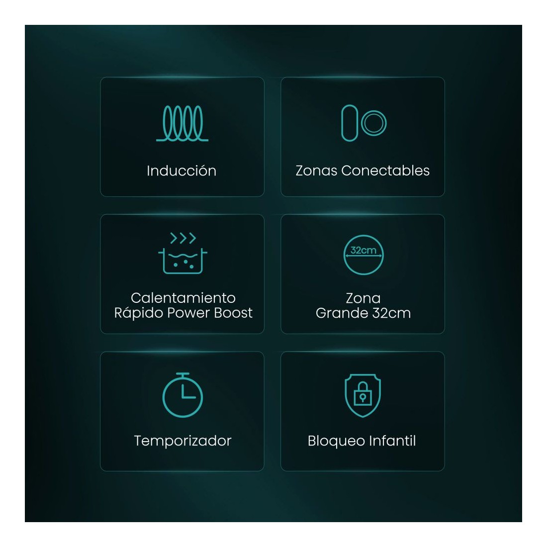 Diseñada para ofrecer eficiencia, seguridad y versatilidad, esta placa de inducción cuenta con tres zonas independientes y control táctil. Incorpora temporizador, función Power Boost para calentar de forma rápida y la opción de zonas puente para ampliar el área de cocción según se necesite.