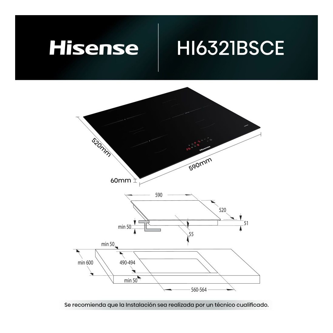 Placa Inducción - HISENSE HI6321BSCE, Negro, 3 Zonas, 7100W