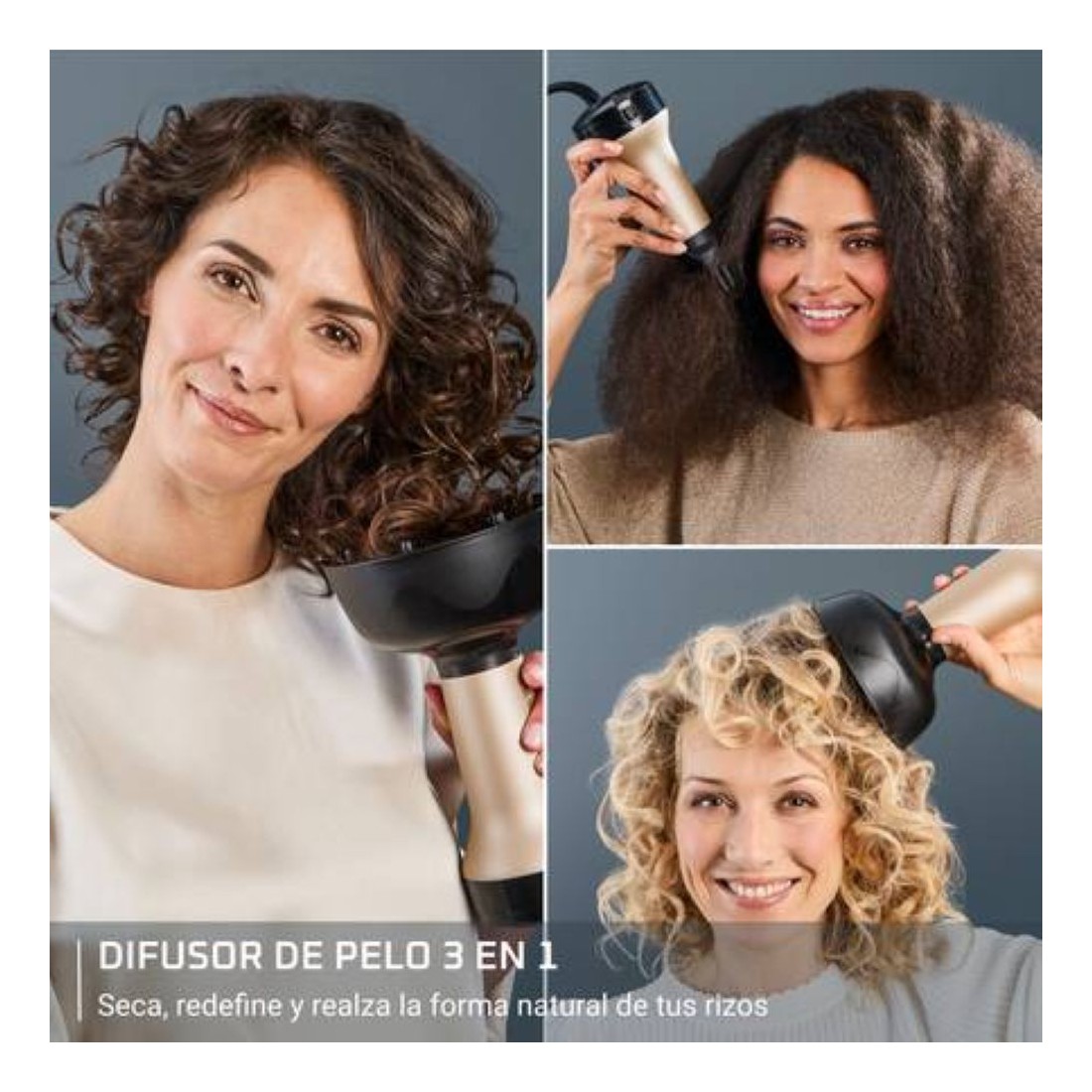 Este difusor de aire caliente ha sido diseñado para quienes buscan un secado suave y una definición perfecta. Con tres accesorios intercambiables, podrás personalizar tu rutina y conseguir resultados profesionales en casa.
