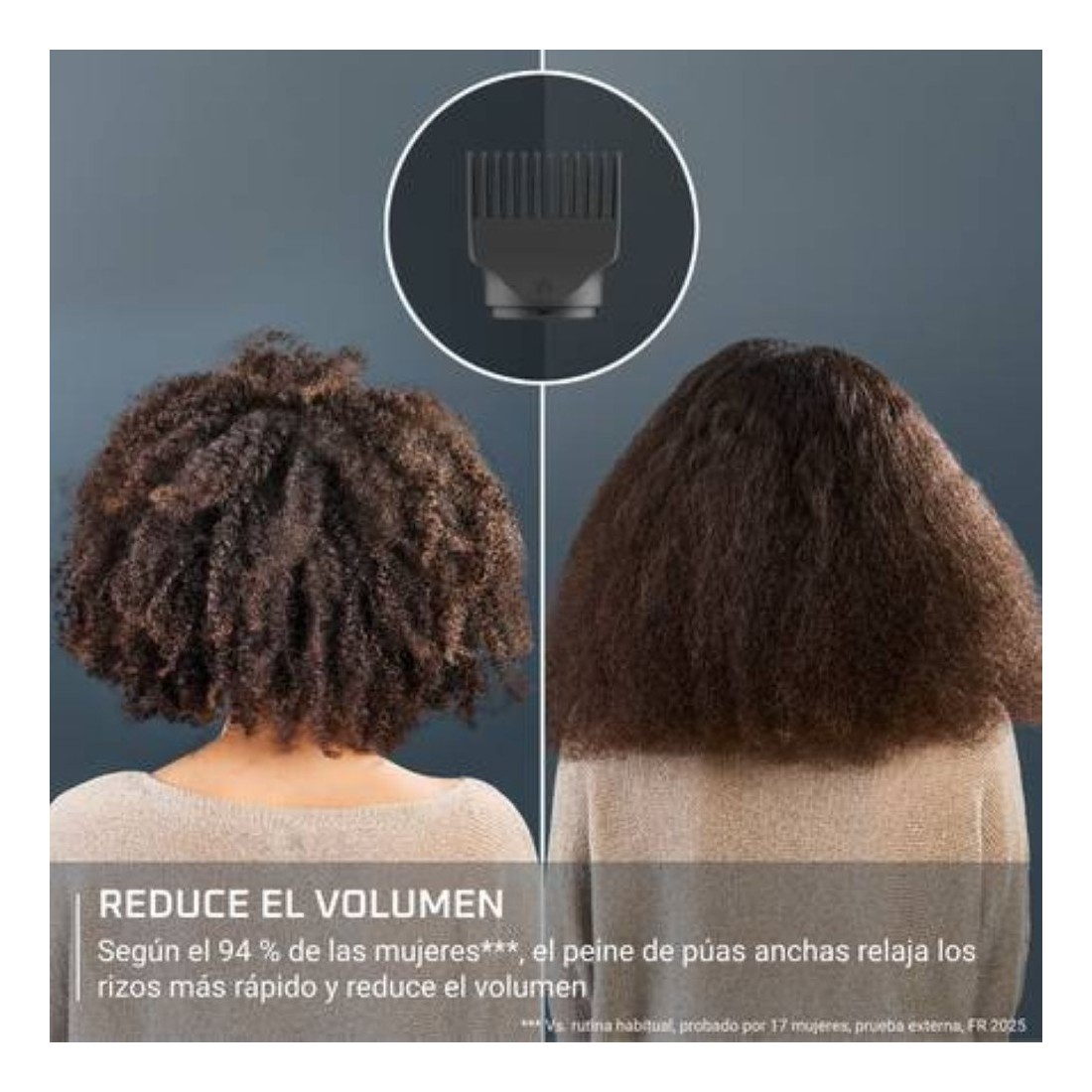Incluye un difusor XL para secado rápido, un difusor para raíces que aporta volumen y un peine de púas anchas para moldear y preparar el cabello. Cada pieza está pensada para cuidar la fibra capilar y facilitar el peinado.