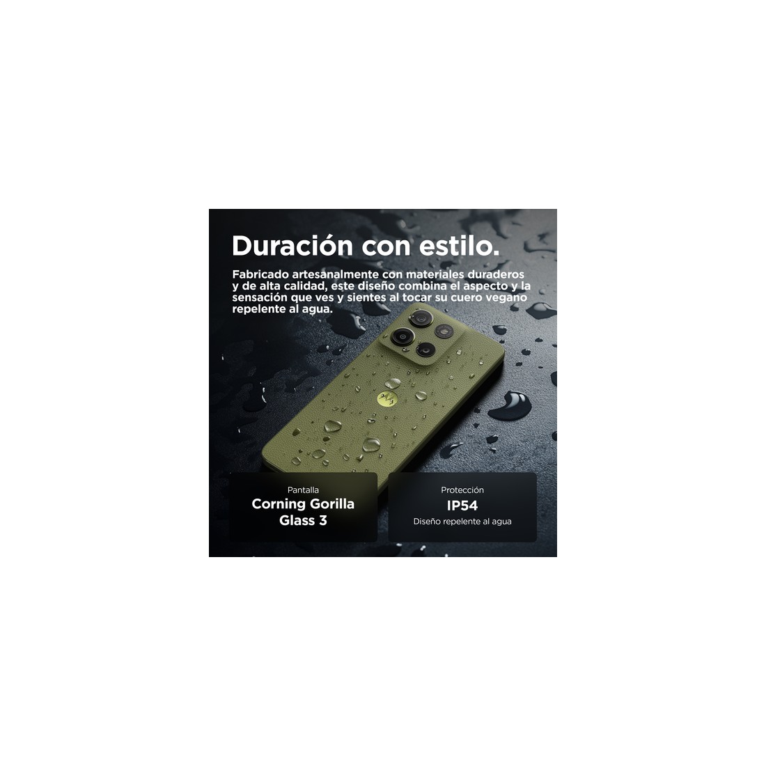 Este smartphone en color verde destaca por su acabado en cuero vegano que combina elegancia y resistencia. Su certificación IP54 lo protege de salpicaduras y polvo, mientras que el cristal Gorilla Glass 3 asegura mayor durabilidad frente a golpes y arañazos. Todo ello en un dispositivo ligero de 190 g que resulta cómodo y sofisticado.