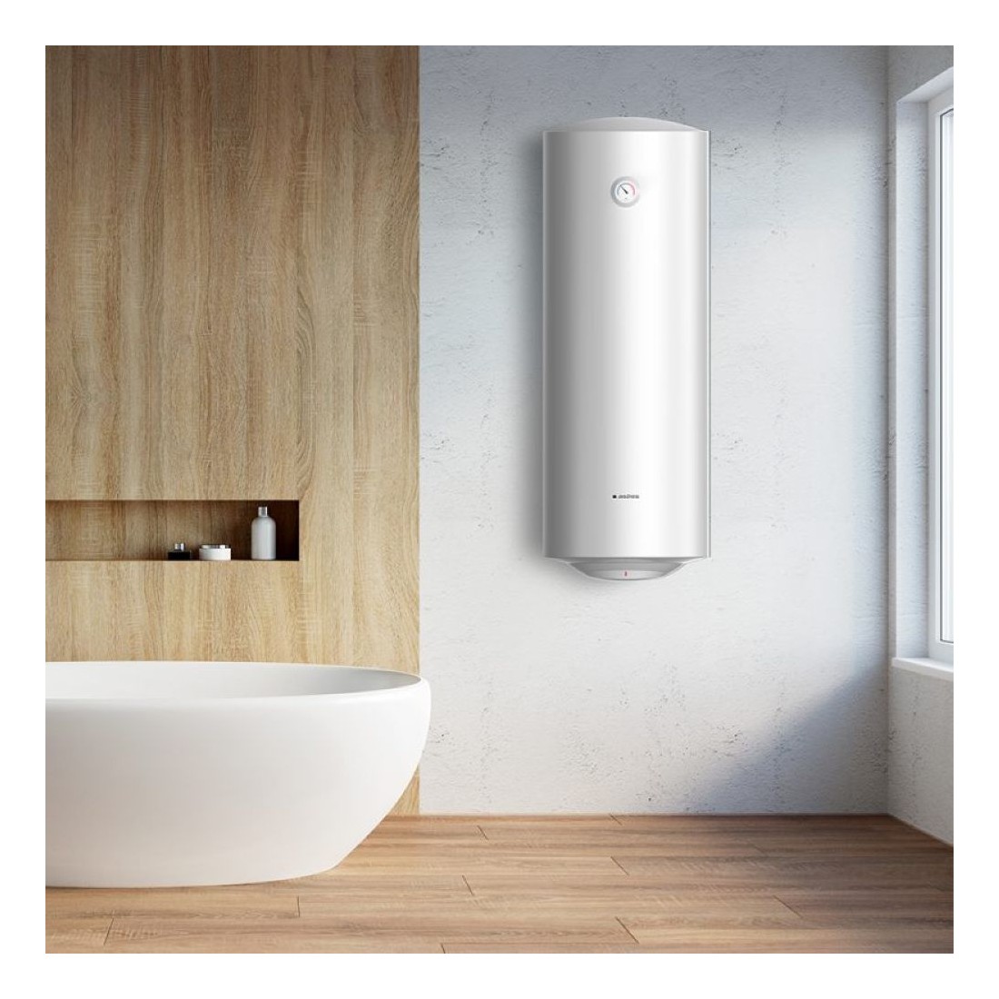 Este termo eléctrico vertical combina una capacidad de 80 litros con una potencia de 1500 W, ofreciendo agua caliente suficiente para el día a día. Su diseño Slim en color blanco se adapta perfectamente a espacios reducidos, sin sacrificar funcionalidad ni estilo. Además, su funcionamiento silencioso (solo 15 dB) garantiza confort en cualquier estancia.