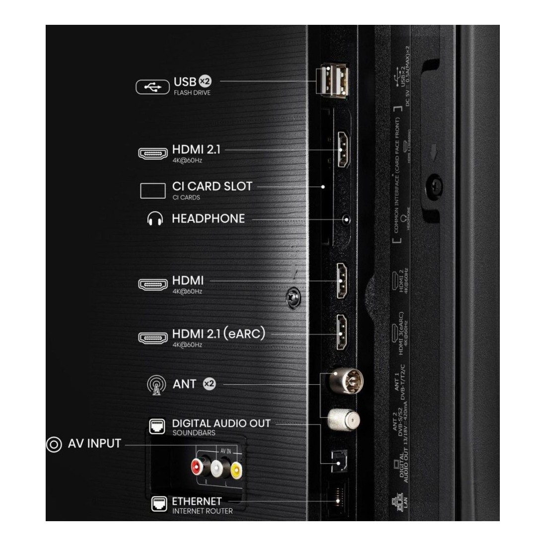 Equipado con DTS Virtual:X y Dolby Audio, el sonido es claro, potente y envolvente. Los dos altavoces integrados ofrecen una potencia RMS de 14 W, ideal para disfrutar de películas, series o videojuegos sin necesidad de altavoces externos. Además, incluye salida para auriculares y eARC para conectar sistemas de sonido avanzados.