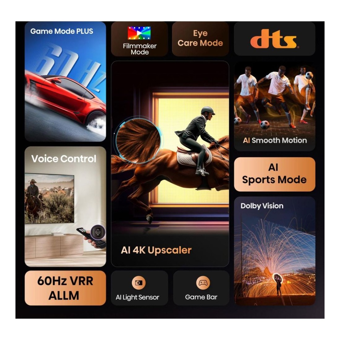 Con Game Mode PLUS, VRR y ALLM, este televisor reduce el lag y mejora la fluidez en juegos de acción. El procesador Quad Core optimiza el rendimiento gráfico, mientras que tecnologías como MEMC y AI Smooth Motion eliminan el desenfoque en escenas rápidas. Perfecto para consolas de última generación y contenido en streaming.